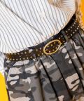 色味を抑えたメタリックカラーがどこか無機質なモードニュアンスを感じさせるオーバル型のリングバックル×ベルト部へは、逆にギラギラと主張する2連でバチバチに打ち込んだボールスタッズでスタイリッシュかつスパンキーなスタイルへと昇華。