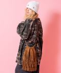 一見して90年代直球のネイティブ/ウエスタンな雰囲気を主張するフリンジデザインが圧倒的にエレガント。贅沢に4段重ねでたっぷりフリンジをあしらったラグジュアリーなグッドムードをベースに、滑らかな触感のスウェード加工を施した合成皮革仕様で上品な高級感へと昇華。ひも状のコードをキュっと絞って巾着ライクな仕様、紐コードにあしらったレトロムードたっぷりなアクリルビーズやストーンで装飾した民族調のアクセント等細部のギミックも抜かりなしの主役バッグ。レトロな90s/Y2Kスタイル、古着ミックスはもちろん、韓国ストリートファッションから、アメカジ、モードスタイルやキレイメスタイルのハズシアイテムとしてもバッチリなマストアイテム。