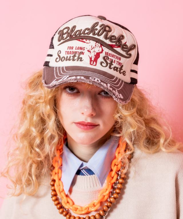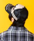一見してアメカジライクな空気感とポップでレトロな90sのノリを感じさせるロゴやプリントの組み合わせデザイン&今期本命のメッシュキャップスタイルがグッドムード。バイザーへの太ステッチやロゴ刺繍、フロントパネルと同生地のコットンを2本ライン使いでサイドへミックスしたアクセントも印象的。まるでヴィンテージ古着のようなエイジングを感じさせるバイザーへのカットオフ貼り付け×クラシカルな雰囲気たっぷりの5パネル&カーブバイザー×機能はもちろん見た目にもクラシックなバックアジャスタースタイルが本命かつ主役顔な一品。90s、Y2Kスタイル、アメカジ、古着ミックスなどクラシックなムードのスタイルはもちろん、韓国ファッション、韓国ストリート、スタイリッシュなモードスタイルやストリートスタイルのハズシアイテムとしても相性抜群。その日の気分やコーディネートの微妙なニュアンスにも答えてくれるカラーバリエーションも◎
