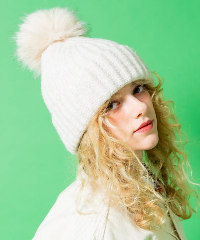 an meets zakka ビッグファーボンボン付き肉厚リブニット帽