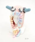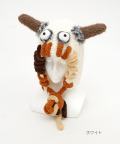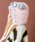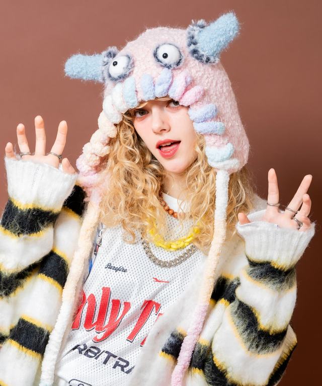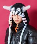 可愛らしくも何を考えてるのかわからないギョロっとした目にプックリ立体な2本ツノ、ザクザク歯のような、紐を縫い付けられたような見ための口?が特徴的な、昨年発見された未確認生物丸出しのモンスターに引き続き、今期も新たに発見された未確認新モンスターデザインが一見してファンタスティック。カワイイだけじゃなくフワフワでムニムニっとした触感のエコファーニット仕様の上品な素材使いで甘辛バランスをとりつつ、キャラによって異なるカラーのコード使いのような独創的なイヤーフラップデザインでエモさ爆発。インフルエンサー界隈、韓国ファッション、SNS,インスタ映え、TikTok・・・全部飲み込んで『カワイイは正義』なキラーアイテム。