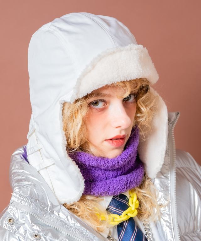 滑らかな艶とタフかつクラシックな雰囲気の表情が上品な高級感を奏でる硬質のポリエステルツイル生地×粒が立った細やかなボア生地コンビがグッドムード。無骨になりがちなフライトキャップスタイルながら、クリーンな雰囲気を漂わせるポリ生地使いに、ボディカラーとあえて同系色で馴染ませたボア使い(カーキのみ別色切り替え配色)、ワイヤー入りで変形できるツバ仕様、バックフェイスもぬかりない連続ステッチデザイン、ダブルリング仕様のベルトコードスタイル・・・むしろ都会の生活に馴染むようなスタイリッシュな世界観が圧倒的にエレガント。90s/Y2Kスタイル、古着ミックスなどのレトロクラシックなトレンドスタイルはもちろん、韓国ストリートファッションやグランジ、アメカジ、ミリタリー、ワークスタイルなどのカジュアル全般、さらにはモードやキレイメといったスタイリッシュなスタイルのハズシアイテムなどなど、どんなスタイルにも馴染んでくれる懐の深い一品。