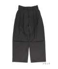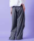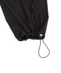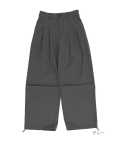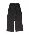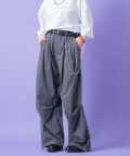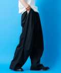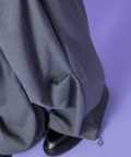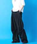クラシックムード漂うフォーマルなTRスーツ素材&薄っすらと浮かぶ極細のピンストライプ柄が一見してエレガント。ダボっとしたワイドなボリュームが裾に向かって柔らかく広がるフレアシルエットをベースに、膝下へのドレープ感がアンニュイなニータックとフォルムを変化させられる裾へのドローコードでパラシュートパンツのミリタリーギミックを大胆にミックスしたアッパーなモードスタイルが印象的。
