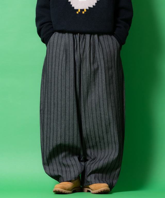 深々ととった股上や超絶極太なワタリ、ズドンと落としたようなスーパーワイドシルエットのストリートスタイルなルーズインパクトはそのままに、ヘリンボーン織りや差番手で立体感をもたせたクラシックムード漂うストライプ柄でレトロエレガントなグッドムードスタイルへとブラッシュアップ。韓国ストリートファッションの『今』を映し出すようなデザインスタイルは、90s/Y2Kスタイル、古着ミックス、アメカジやワークスタイルなどのクラシックムードなスタイルはもちろん、スケーター、ストリートスタイル、グランジといったカジュアル全般、さらにはモードスタイルやキレイメなどのハズシアイテムやアクセントとしても◎