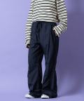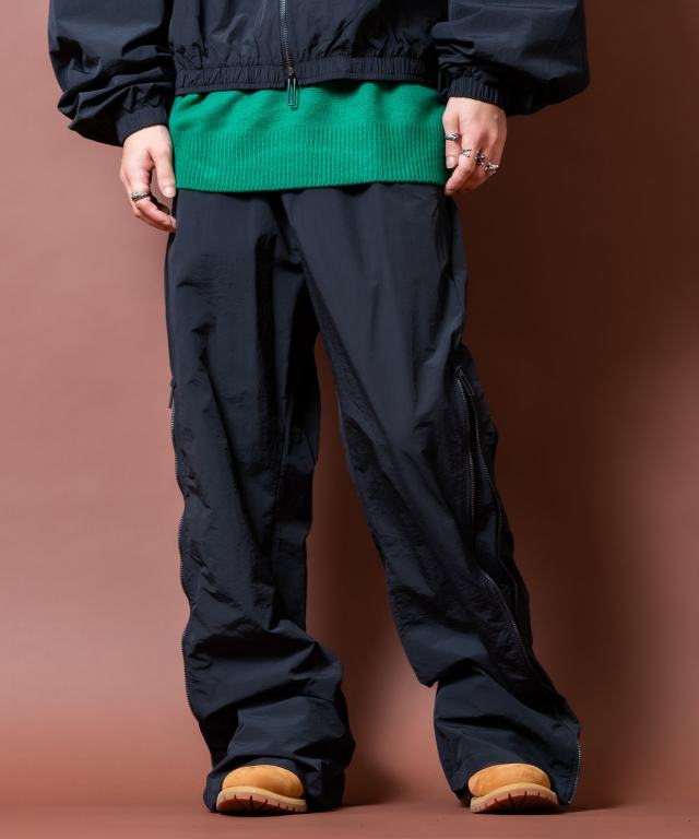 a.p.o.v. サイドジップ変形ワイドフレアナイロントラックパンツ