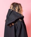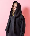 顏を覆う程の大きなフード×たっぷり首回りにボリュームをもたせてくれるワイド&ロングのマフラーパターンでストリートライクかつダーティーな雰囲気がグッドムード。フロント淵にあしらった大粒のアイレットをスタッズ打ちしたアッパーかつどこか無機質なモードニュアンスを漂わせるアクセントも好ギミック。コットンミニ裏毛のスウェット素材、ラギッドな生デニムと、キャラクターの異なるブラックカラーの2パターン展開。韓国ストリートファッション、スケーター、ストリートスタイル、モード等はもちろん、90s、Y2Kスタイル、古着ミックスやアメカジといったニュートロな空気感のアクセントとしても使いまわしのきく一品。