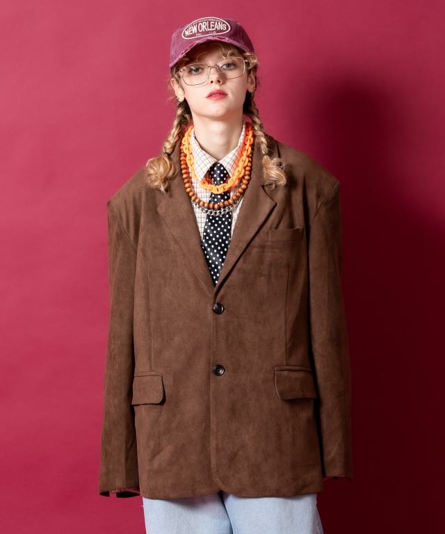 柔らかな触感と一見して上品な表情が印象的なスウェード加工を施した合成皮革があまりにもエレガント。2ボタン仕様のクラシックなスタイルとも相性抜群で、無駄を削いだシンプルかつミニマルなギミックも素材感の高級感や存在感を邪魔しない重要なポイント。羽織るだけでいつものスタイルをワンランク引き上げてくれる『主役顔』な一着。90s/Y2Kスタイル、古着ミックス、アメカジやワークスタイルなどのクラシックムードなスタイルはもちろん、韓国ストリートファッション、スケーター、ストリートスタイル、グランジといったカジュアル全般、さらにはモードスタイルやキレイメなどのハズシアイテムやアクセントとしても◎