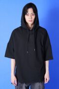 軽やかで滑らかな触感とクラシカルなスウェット感を両立させるコットン甘編み裏毛素材×SSシーズンを広くカバーできる半袖仕様のプルオーバーフーディ/パーカー。ダブダブっとしたルーズな身幅や滑らかに肩を落としたドロップショルダーのオーバーサイズ/ビッグシルエットが印象的。メンズレディース問わずユニセックスで◎