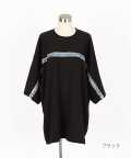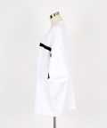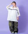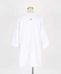 シンプルな無地ボディーをキャンバスにラフに絵に描いたようなタッチでアームから胸元を通って逆サイドのアームまで真横一文字に引かれたペイントラインが圧倒的な存在感。アーム半分下とその横のラインに沿ってボディーも切り替えしたパターンを隠すようにプリントすることで繋ぎ目の無い浮遊感たっぷりかつどこか違和感を感じさせるアーティスティックでモードフルな世界観がエレガント。バックにパッチングしたロゴ入りスクエアポイントがワンアクセント。