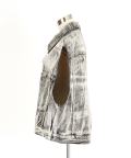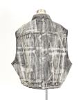 一見してヴィンテージライクかつどこか無機質なモード感漂うラギッドな雰囲気が圧倒的な存在感のメガブリーチコットンデニム生地が衝撃的。黒色のデニムを白色になるまでハードに色落ちさせたアッパーな表情×無骨でクラシカルなトラッカージャケットスタイルを現代モード的なアプローチのストリートニュアンスに変換させる幅広のオーバーサイズシルエットも世界観にマッチ。半袖やノースリーブアイテムとのレイヤードはもちろん、長袖Tシャツやシャツなどとのレイヤード、コートやジャケットのインナーにもってきても・・アイデアと感性で自由に『使い倒せる』汎用性抜群な一着。同デザインのパンツとのセットアップスタイルでも◎