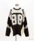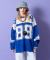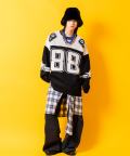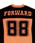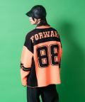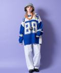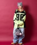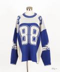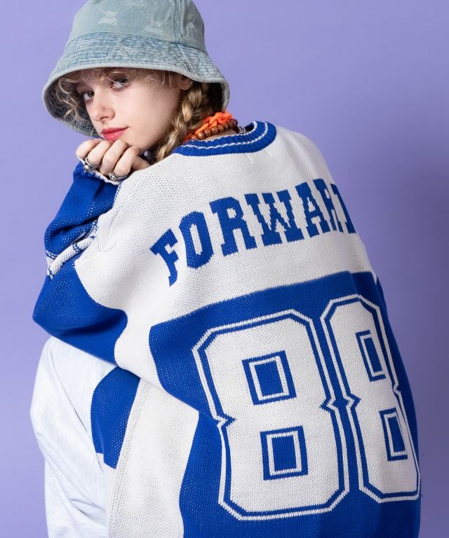 昨今盛り上がりを見せるイットなブロークコアスタイルの本命フットボールシャツ/ホッケーシャツなどのゲームジャージデザインを、切り替えカラーやビッグナンバリング、ヨークロゴプリントなどで忠実に再現&表現したアッパーかつインパクト溢れるデザインが印象的。本格的なゲームシャツモチーフながら、もちろん肉厚のアクリルニットが高級感あるセーターとしてもサマになる主役顔な一枚。90s、Y2K、ストリートスタイル、古着ミックスなどのニュートロなトレンドスタイルはもちろん、韓国ストリートファッション、モードスタイルなどキレイメなスタイルのハズシアイテムとしても◎