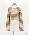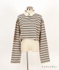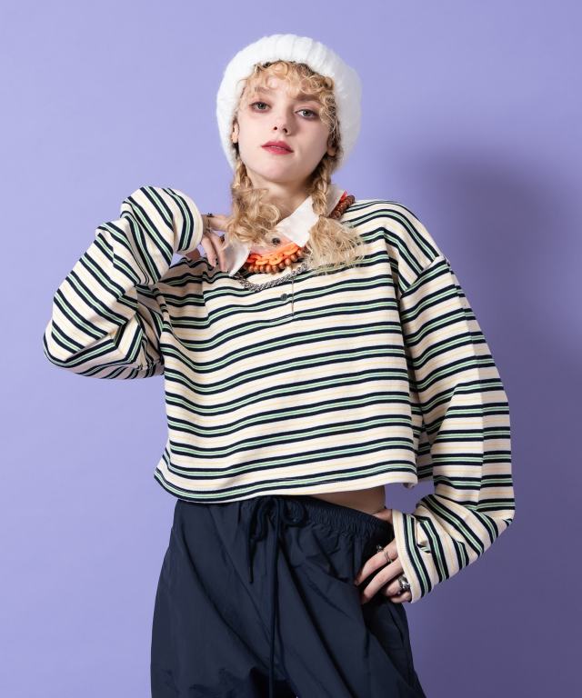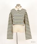 ボーダー甘編み裏毛クロップドラガーシャツ / ユニセックス メンズ レディース 柄 短丈 ショート丈 オーバーサイズ ポロシャツ 長袖