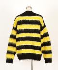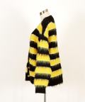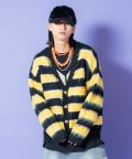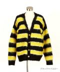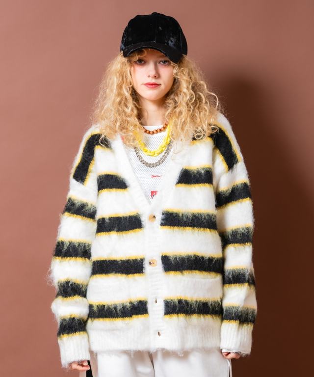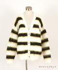 ファー混肉厚ニットワイドボーダーオーバーサイズカーディガン / ユニセックス 柄 ウールタッチ アンゴラタッチ vネック