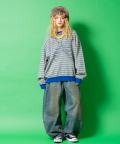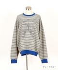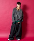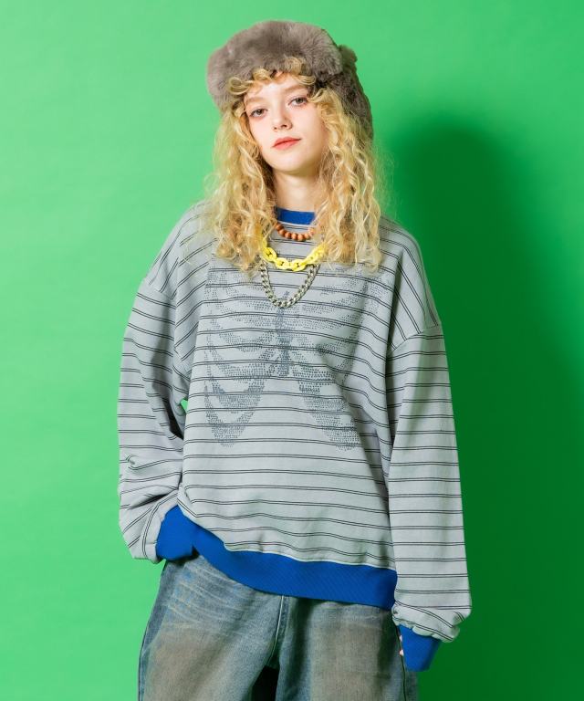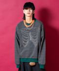 モザイクドットボーンプリントオーバーサイズボーダー配色リブ切替ピグメントスウェットカットソー / ユニセックス 長袖 ロングスリーブ Tシャツ スエット 柄 2トーン