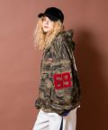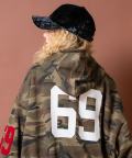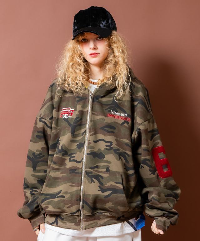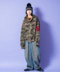 胸元への手の込んだロゴ&マーク刺繍、アームへの発色の良い大きなサガラワッペン仕様のナンバリング、バックへのナンバリングプリント・・・まるでレトロなスタジャンを彷彿とさせるデザインをウォッシュド加工でヴィンテージライクな雰囲気の迷彩柄スウェットでまとめあげたデザインが一見して存在感マックス。肉厚のネオプレーンテイストのスウェット素材使い、ダボダボのスーパーオーバーサイジングながら丈感を短めにとった短丈のイットなフォルムワークも完璧で、主役トップス間違いなしの一着。韓国ストリートファッションをはじめとし、90s/Y2Kスタイル、古着ミックス、アメカジやワークスタイルなどのクラシックムードなスタイルはもちろん、スケーター、ストリートスタイル、グランジといったカジュアル全般、さらにはモードスタイルやキレイメなどのハズシアイテムやアクセントとしても◎