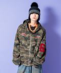 サガラワッペンロゴ刺繍&ナンバリングスタジャンライク迷彩柄スウェットオーバーサイズクロップド丈ジップアップパーカー / ユニセックス ZIPフーディー 短丈 カモフラ