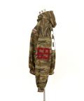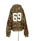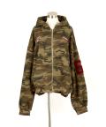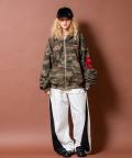 a.p.o.v. サガラワッペンロゴ刺繍&ナンバリングスタジャンライク迷彩柄スウェットオーバーサイズクロップド丈ジップアップパーカー