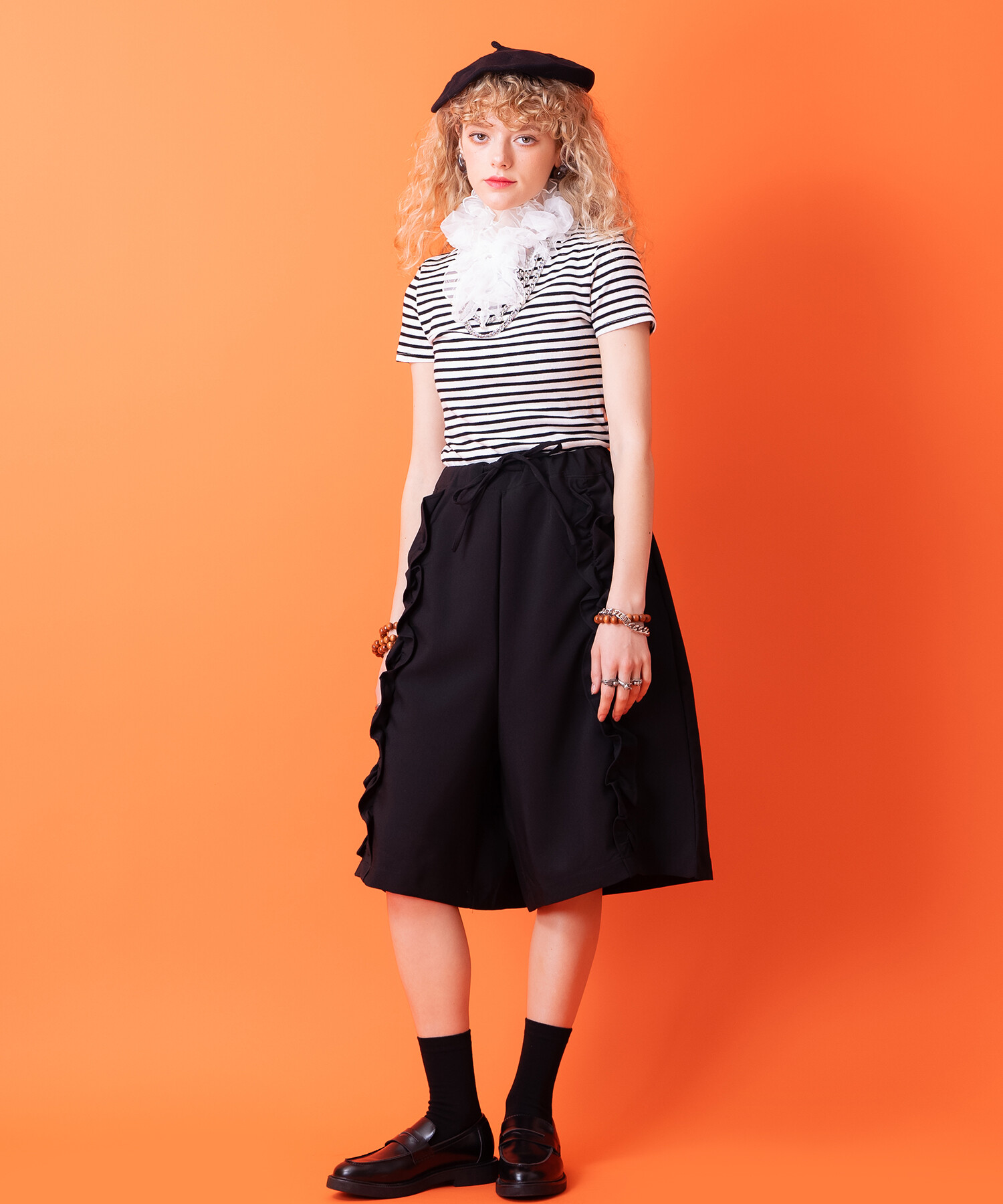 ワシャワシャっとしたギャザーでのフリルデザイン&ポイントでのパール使いが首回りにエレガントなポイントを作り出してくる一本。