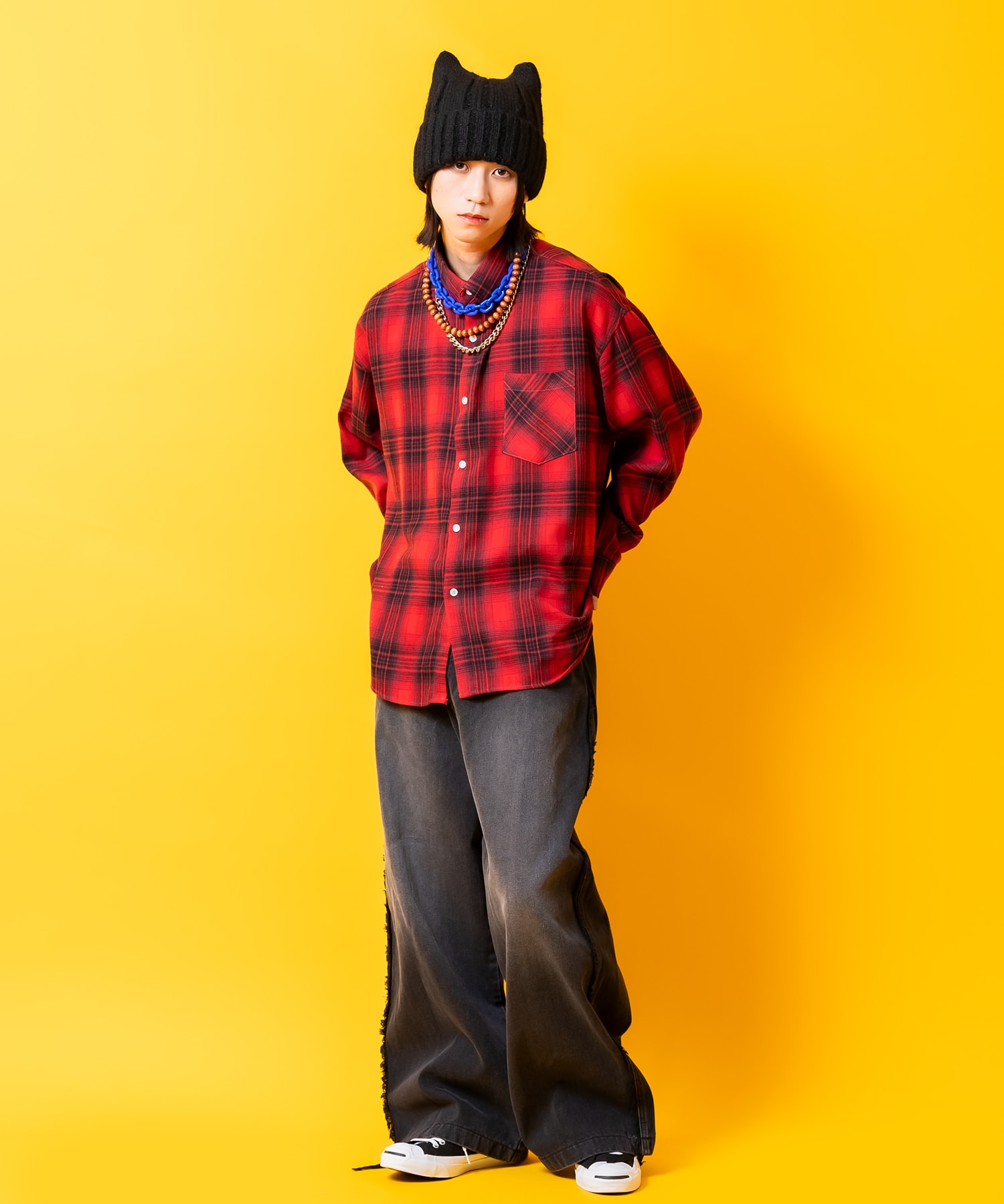 プクっとキュートに主張するネコ耳デザイン×モケモケっとカールした上品なファー混のスウィートなグラマラスニュアンスを奏でる肉厚アクリルニットコンビが一見してスーパーキュート。ウールタッチの超肉厚生地の高級感をベースに折り返し部分の立体的なワイドリブ、ボディーの超極太などこかレトロな空気感のリブデザインも上品かつエレガントなポイント。耳付きデザイン×素材感を映えさせる無駄を削いだミニマルな無地スタイルも世界観を加速。韓国ファッション、韓国ストリートはもちろんのこと、90s/Y2Kスタイルに古着ミックスタイルやアメカジなどクラシカルなニュアンスのトレンドから、ストリートスタイルやモードスタイルといったスタイルのハズシアイテムとしても相性抜群。インフルエンサー界隈、韓国トレンド、SNS,インスタ映え、TikTok・・・全部飲み込んで『カワイイは正義』なキラーアイテム。