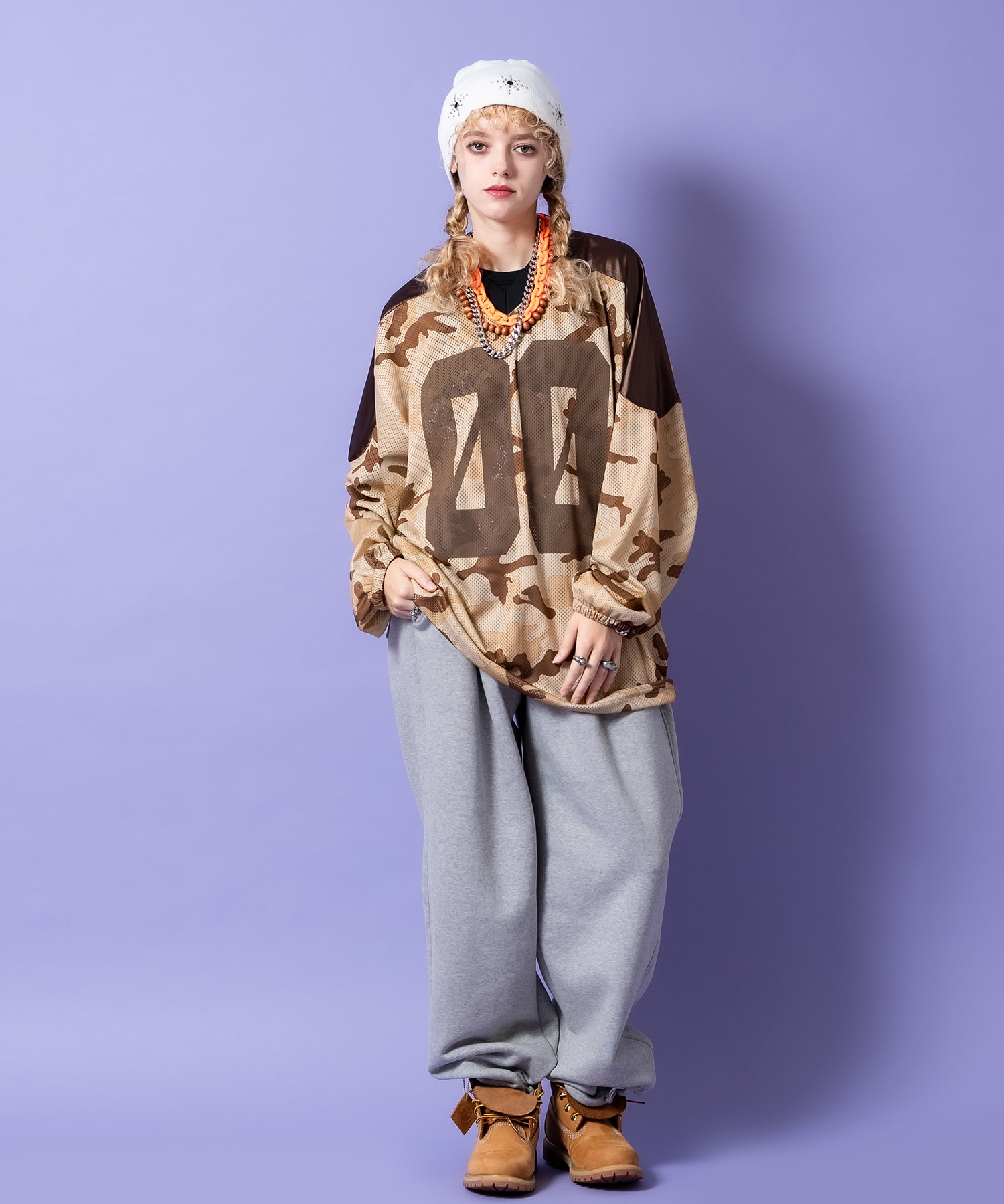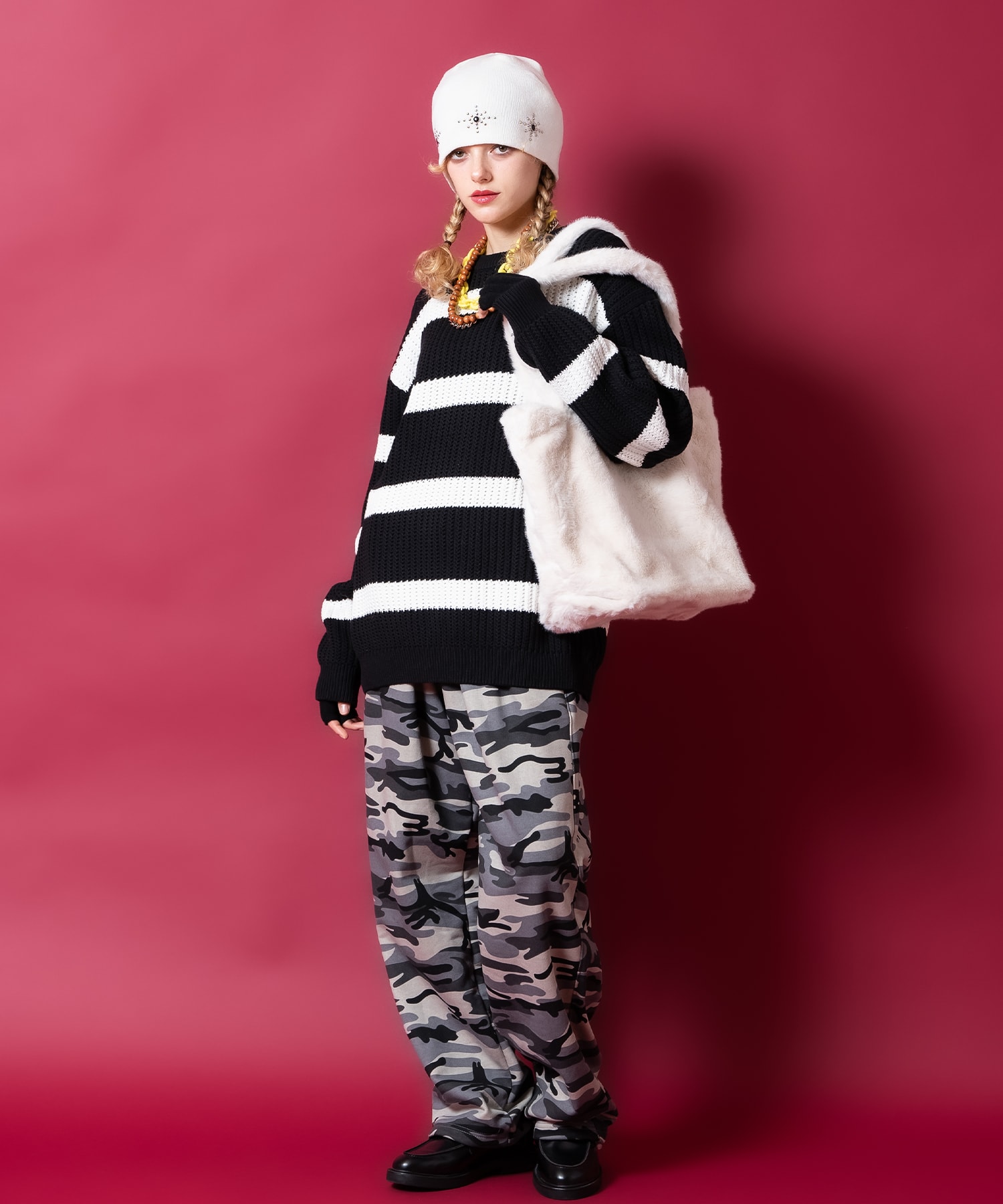 ややトップにボリュームを残して耳部がしっかり隠れる程度の折り返し無しで被れるアクリルニットシングルワッチスタイル×大粒のアクリルブラックストーンを囲むようにマーク打ちしたミニボールスタッズの90sムード漂うネイティブ調デザインがグッドムード。コテコテのネイティブ調とは違いストリートなバランスをけして損なわないようにキープしたデザインバランスは主役ヘッドギアとしてコーデに取り入れたくなること間違いなし。90s、Y2Kスタイル、アメカジ、古着ミックスなどクラシックなムードのスタイルはもちろん、韓国ファッション、韓国ストリート、グランジ、スタイリッシュなモードスタイルやストリートスタイルといった様々なスタイルにおすすめ。定番的なコーデ馴染みの良いカラー展開も◎