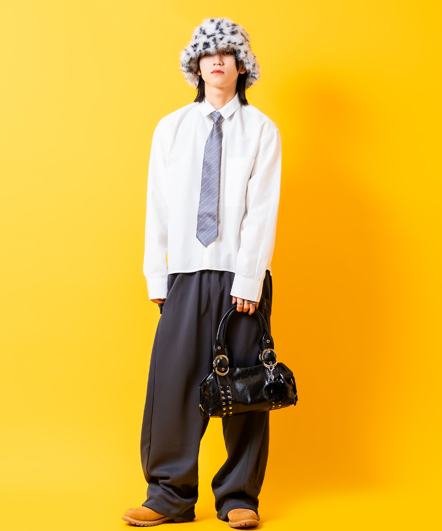 丸みのあるスクエア型フォルム&横長ミニサイズのトレンド感溢れるシルエット×レトロな雰囲気のシワ感とオイリーな艶感がアンティークかつ高級感たっぷりな肉厚の合成皮革をベースに、2連でハードにリベットスタッズを打ち込んだスパンキーなアクセントが印象的。サイドに巻き込むようにあしらったベルトやハンドルへの調節バックルベルト、ジップファスナーをシルバーで統一し高級感とロッキンなニュアンスを表現するギミックも◎。レトロな90s/Y2Kスタイル、古着ミックスはもちろん、韓国ストリートファッションやモードスタイル、グランジから、アメカジなどのカジュアルなスタイルのハズシアイテムとしても相性抜群な一品。