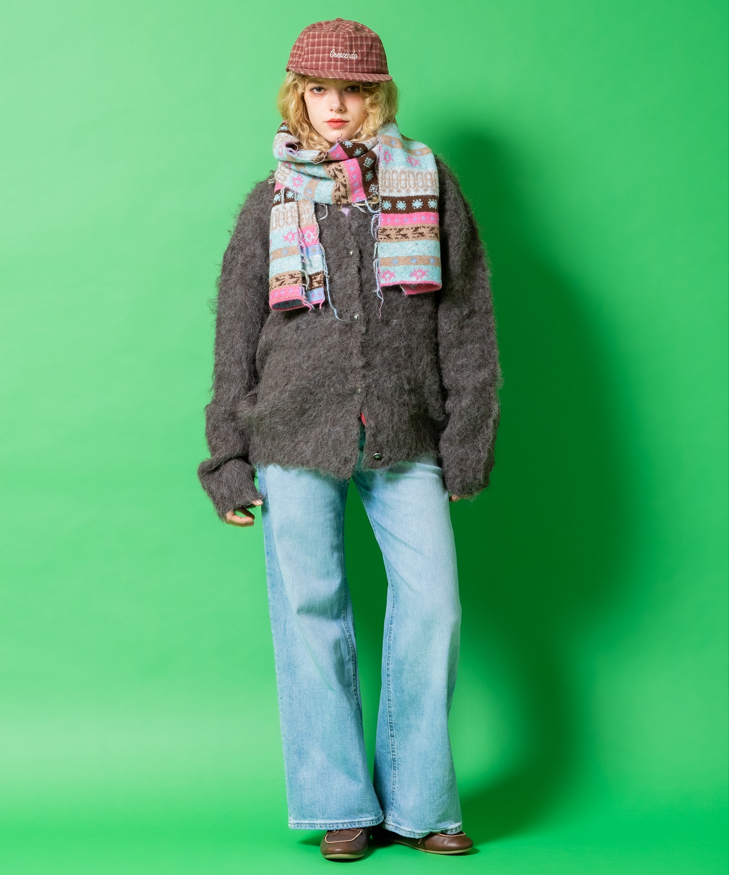 独特の柄模様や色味がレトロでスウィートな雰囲気の民族調ネイティブ柄×フワフワっとした触感でファー混の上品かつ高級感たっぷりなウール混アクリル生地を編み込んだクラシックなコンビデザインがグッドムード。サイドの淵に沿って与えたダメージ加工で糸を出したクラッシュフリンジのグランジライクなアクセント、どこか無機質なモードニュアンスを感じさせるスクエア型のカッティングワーク、高級感ある素材感とアイキャッチーな柄、色味・・ワンポイントかつ主役アイテムとしてもマストな一本。90s/Y2Kスタイル、古着ミックスなどのレトロクラシックなトレンドスタイルはもちろん、韓国ストリートファッションやグランジ、アメカジ、ワークスタイルなどのカジュアル全般、さらにはモードやキレイメといったスタイリッシュなスタイルのハズシアイテムなどなど、どんなスタイルにも馴染んでくれる懐の深い一品。差し色やポイント作り、色合わせなど幅広く対応できる豊富なカラーバリエーションも◎