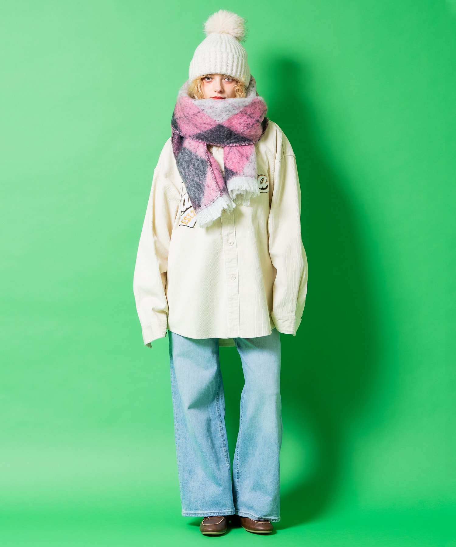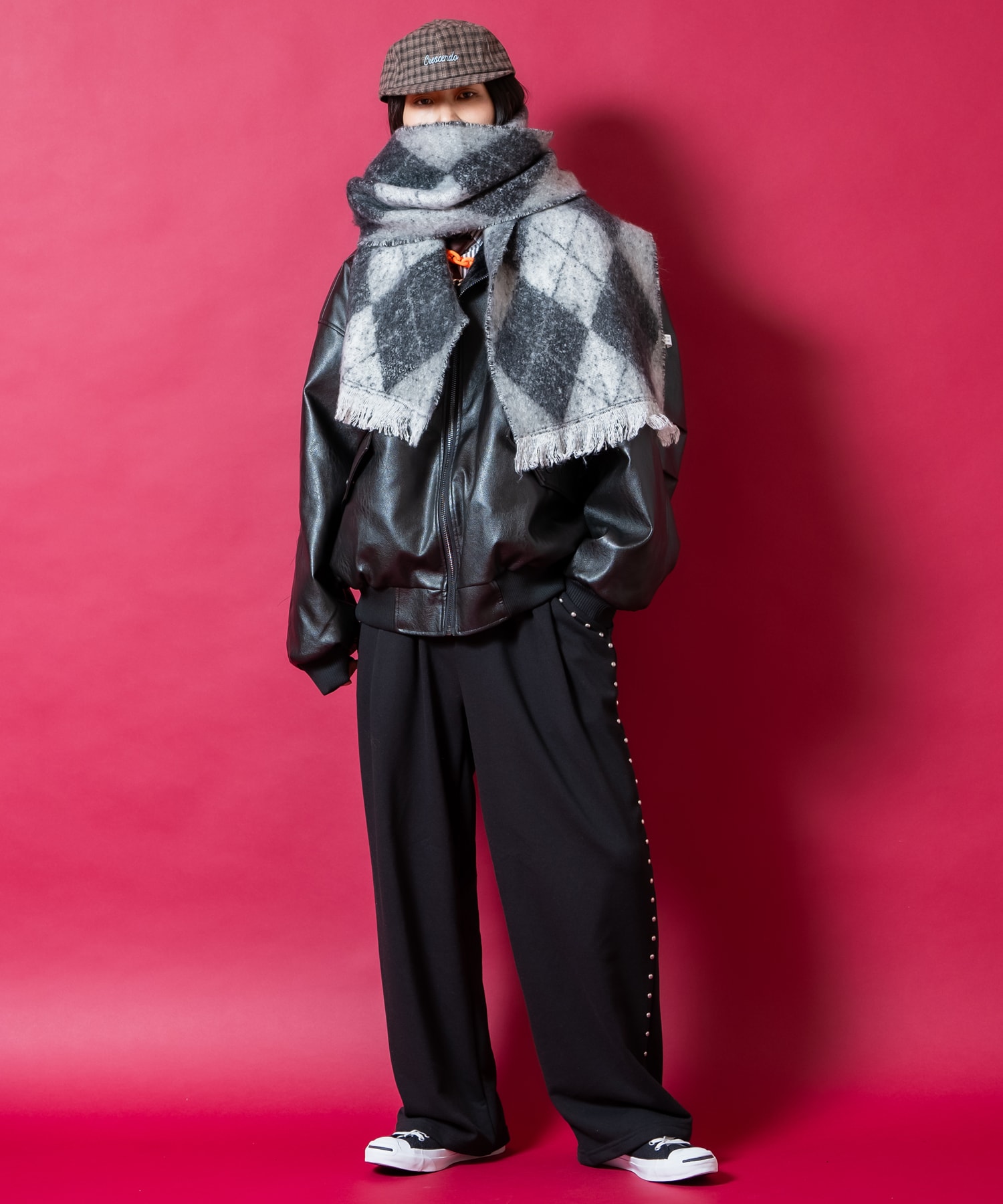 クラシカルでレトロな空気感漂う大柄のアーガイル柄×フワフワっとしたした触感と見た目にもスウィートなモケモケっとした起毛感が上品なファー加工のポリ生地が一見してグッドムード。アクセントで取り入れた目の細やかなフリンジもエレガント。高級感ある素材感とアイキャッチーな柄、色味・・ワンポイントかつ主役アイテムとしてもマストな一本。90s/Y2Kスタイル、古着ミックスなどのレトロクラシックなトレンドスタイルはもちろん、韓国ストリートファッションやグランジ、アメカジ、ワークスタイルなどのカジュアル全般、さらにはモードやキレイメといったスタイリッシュなスタイルのハズシアイテムなどなど、どんなスタイルにも馴染んでくれる懐の深い一品。