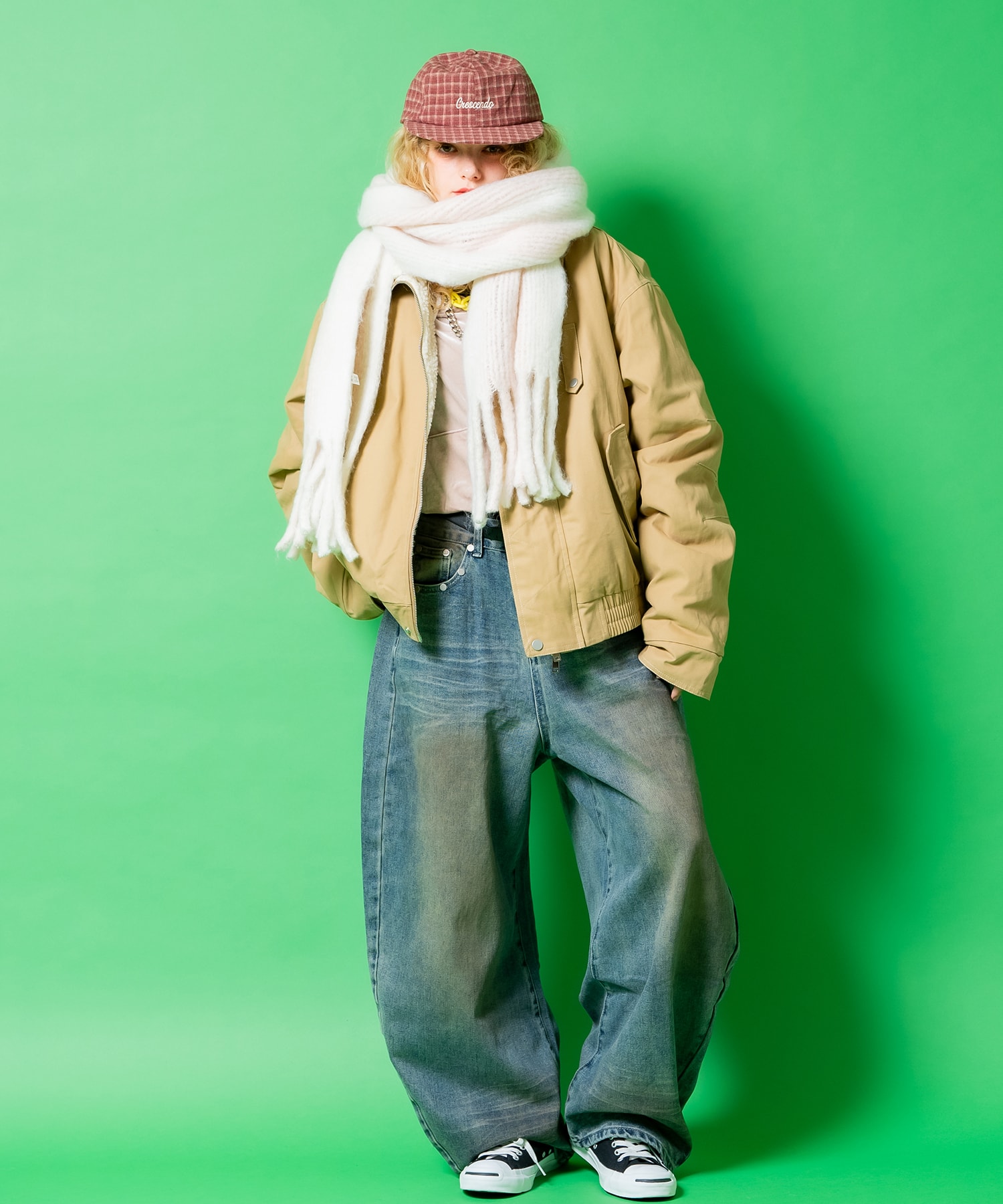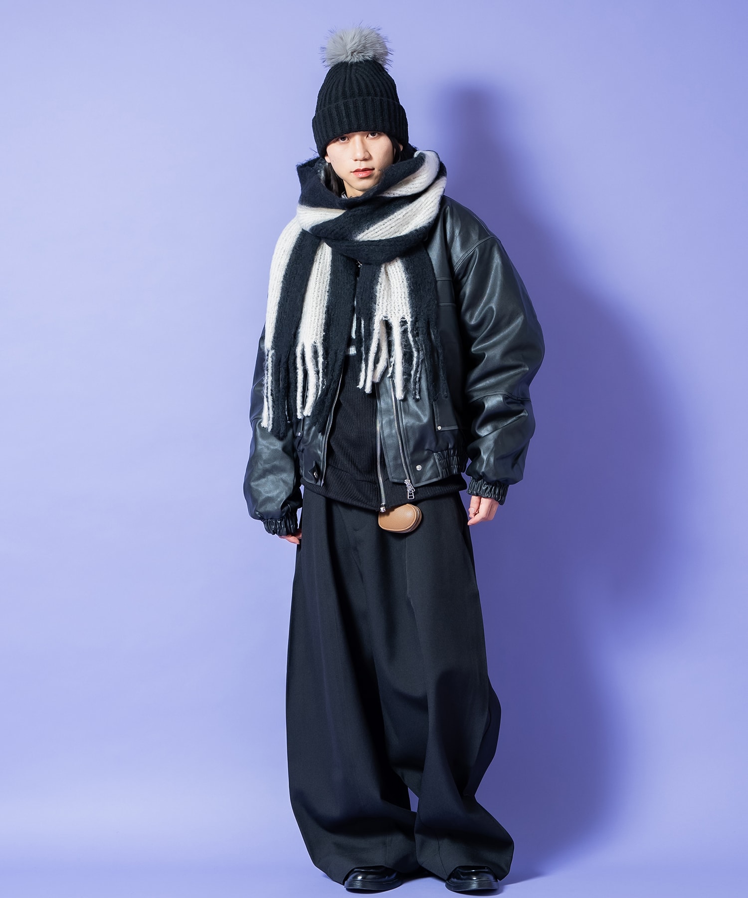 バチっと主張するポップでレトロかつどこか無機質で上品なニュアンスが印象的なワイドピッチのツートーンストライプ柄×フワフワっとした触感にモコモコのボリューム、モケモケっと起毛させたファーのような上品かつ高級感たっぷりなポリエステル生地をザクザクっとした超ローゲージで編み込んだクラシックなコンビデザインがグッドムード。高級感ある素材感とアイキャッチーな柄、色味・・ワンポイントかつ主役アイテムとしてもマストな一本。90s/Y2Kスタイル、古着ミックスなどのレトロクラシックなトレンドスタイルはもちろん、韓国ストリートファッションやグランジ、アメカジ、ワークスタイルなどのカジュアル全般、さらにはモードやキレイメといったスタイリッシュなスタイルのハズシアイテムなどなど、どんなスタイルにも馴染んでくれる懐の深い一品。差し色やポイント作り、色合わせなど幅広く対応できるカラーバリエーションも◎