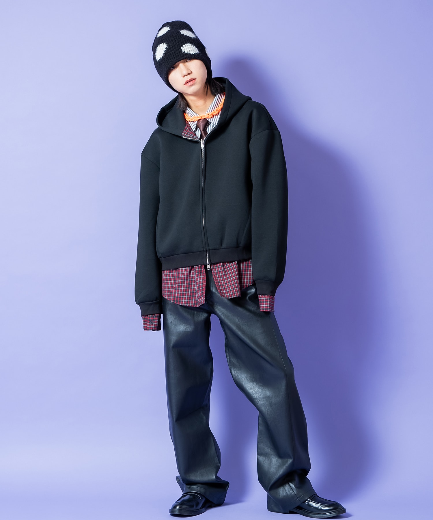 アルパカやウールといった高級素材を編み上げた肉厚かつ防寒性マックスなニット仕様×大粒のドット柄を幅広であしらったスウィートかつどこか無機質なモードニュアンス漂う柄模様のコンビが一見してグッドムード。やや長めにとられたシルエットを折り返し無しのビーニースタイルで被る黒白ドット柄は、折り返して反転したドット柄が現れるファニーでエレガントなデザインを採用した可愛らしくもスパイシーなインパクトスタイルへと変貌可能。90s/Y2Kスタイル、古着ミックスなどのレトロクラシックなトレンドスタイルはもちろん、韓国ストリートファッションやグランジ、アメカジ、ミリタリー、ワークスタイルなどのカジュアル全般、さらにはモードやキレイメといったスタイリッシュなスタイルのハズシアイテムなどなど、どんなスタイルにも馴染んでくれる懐の深い一品。