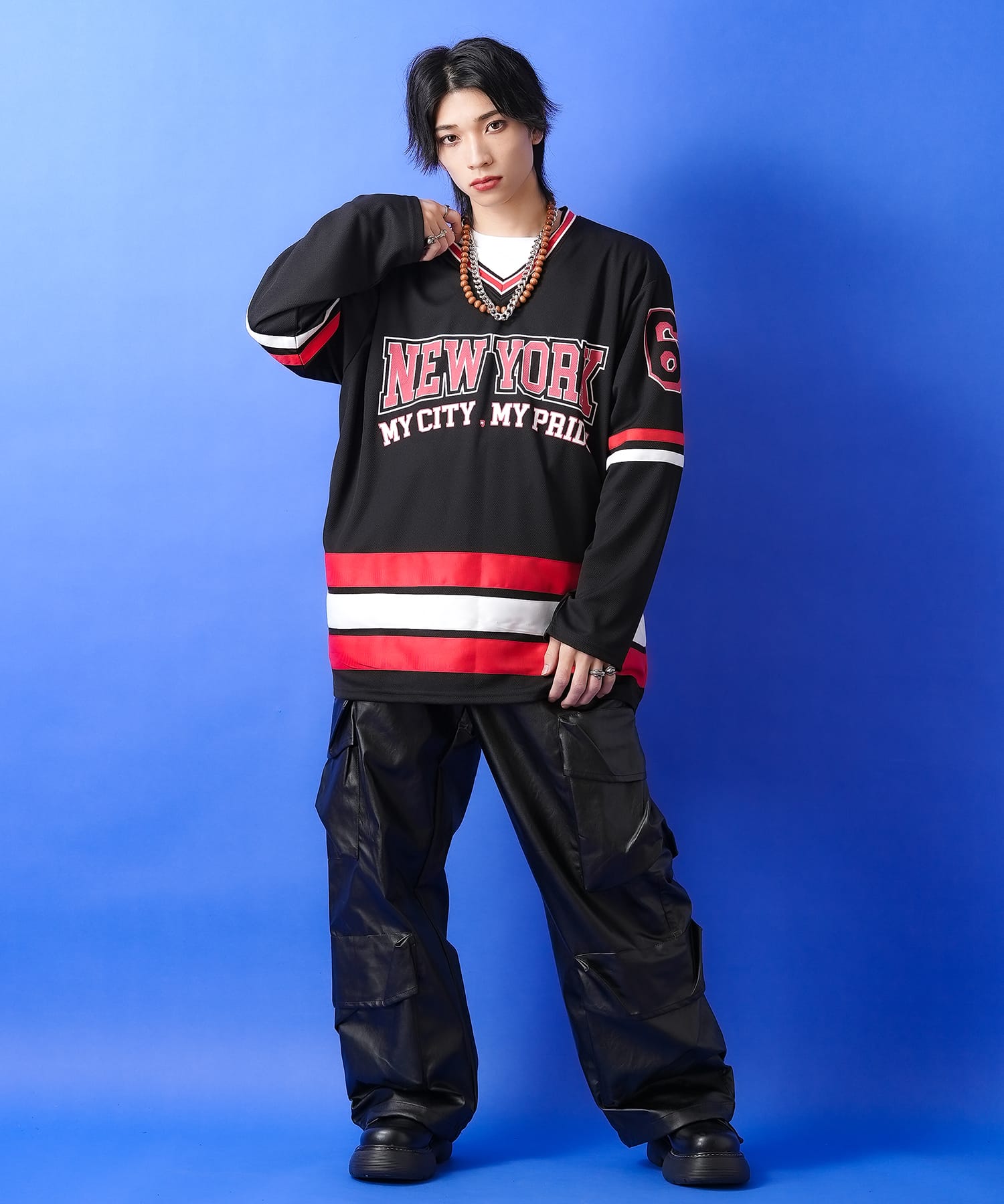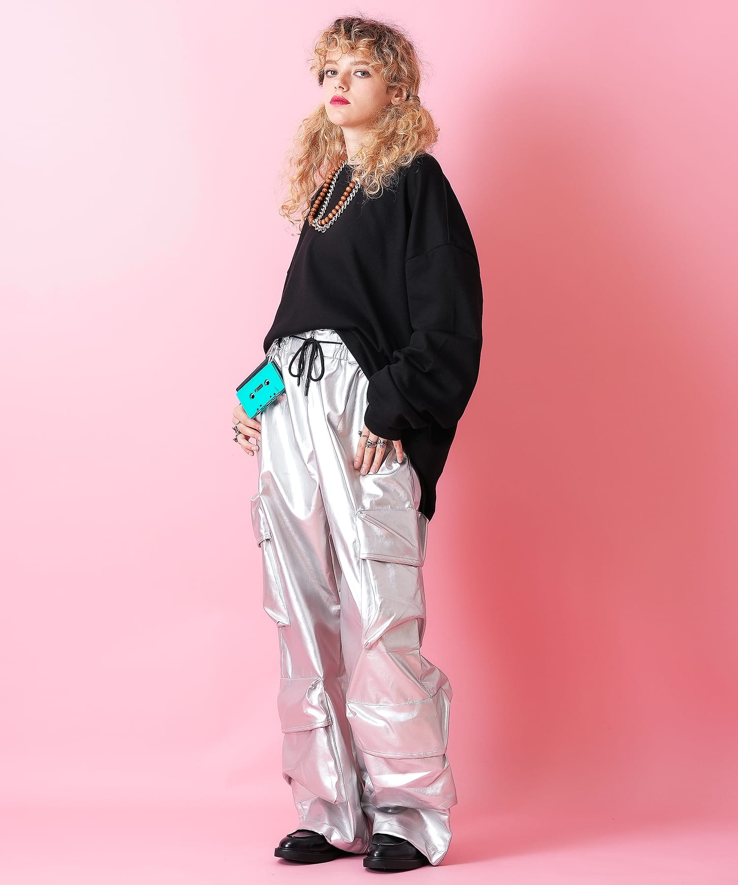 左右に2個づつ計4連で配置した大きな立体フラップポケット×極太ワイドシルエットがインパクト。ネクストトレンド筆頭のY3Kなメタリックシルバーカラーの合成皮革、レトロで高級感あるシックな印象のマットなブラック合成皮革の2パターンどちらも主役顔。
