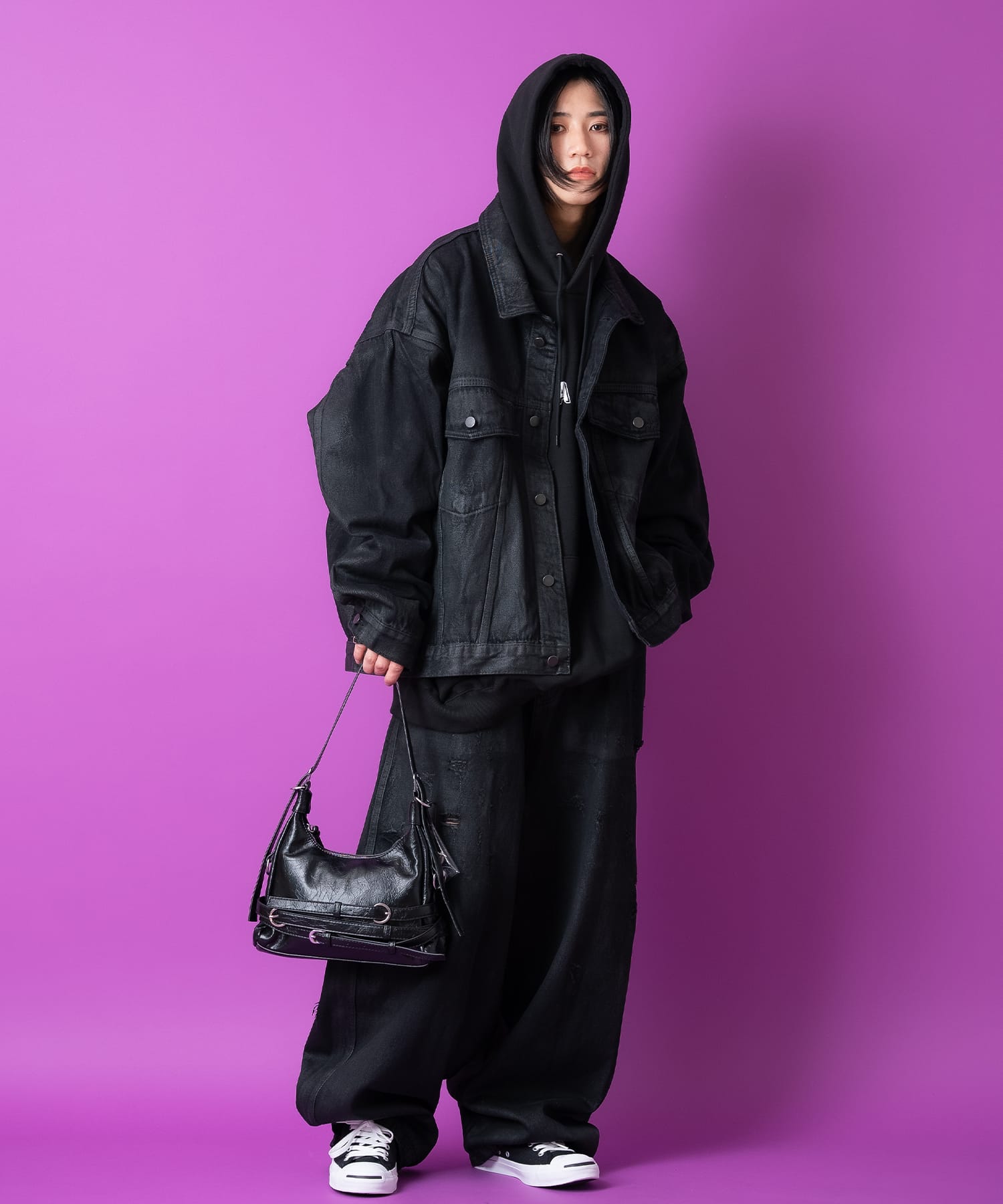 極太バルーンの立体的なバレルレッグシルエット×シャイニーでオイリーなコーティングをデニムにオンしてトレンドのブラックデニムをワンランク上に押し上げるモードかつラグジュアリーな表情へとブラッシュアップ。やり過ぎないバランスで要所にダメージ加工/クラッシュ加工を施しグランジなニュアンスもミキシング。同デザインのデニムジャケットとのセットアップでも着用可能。