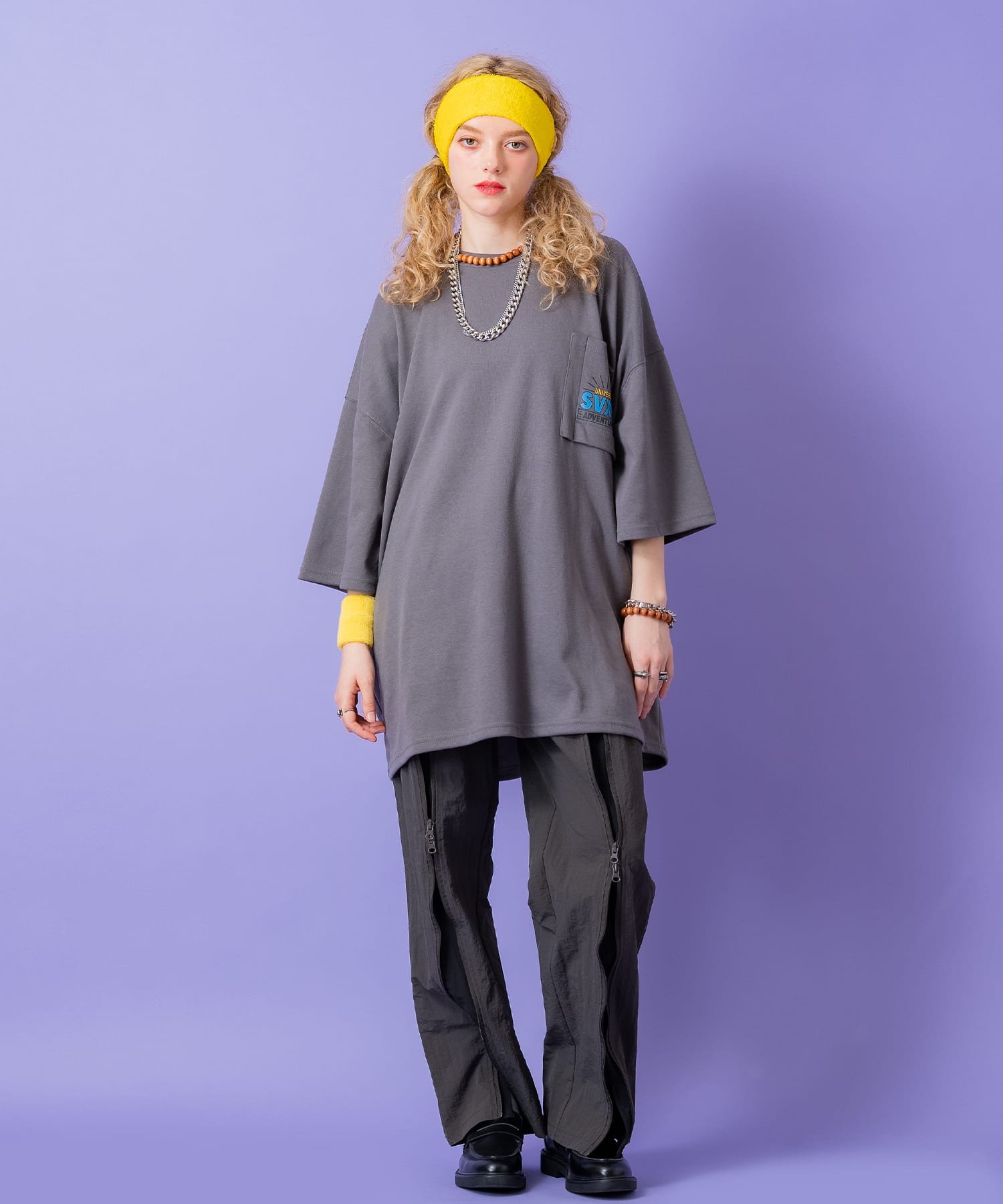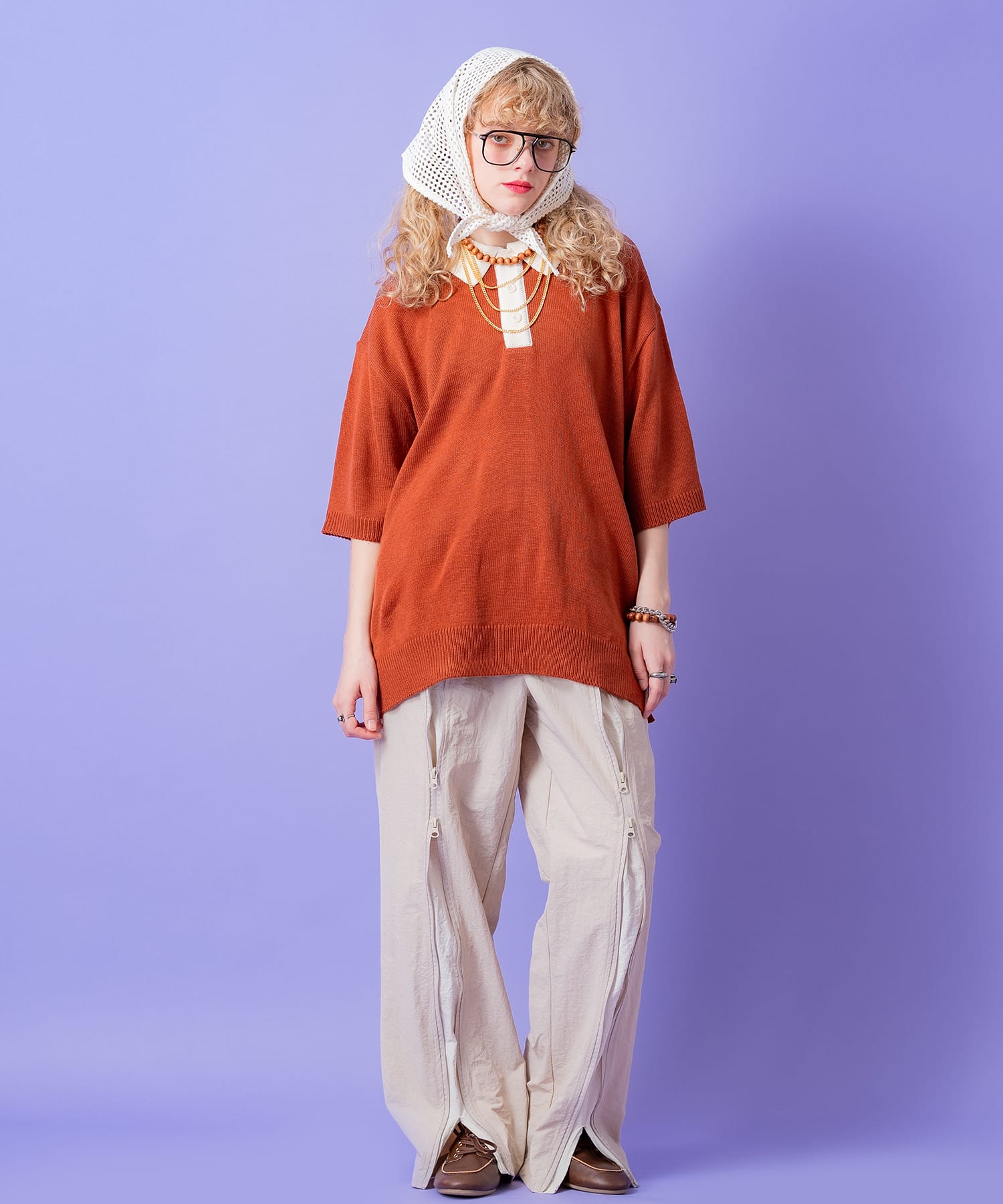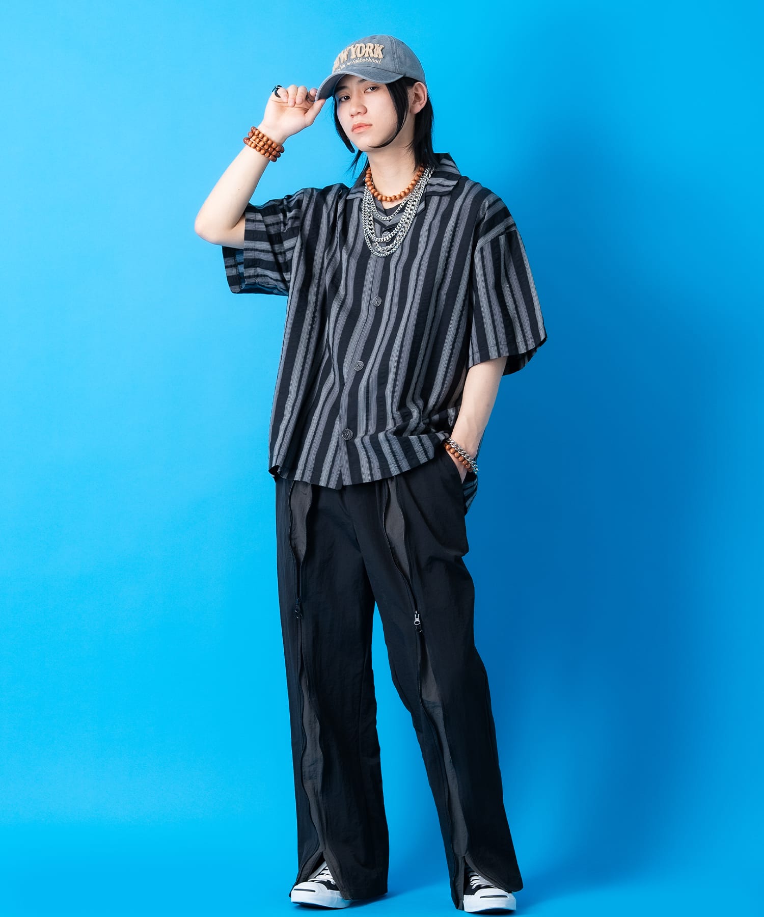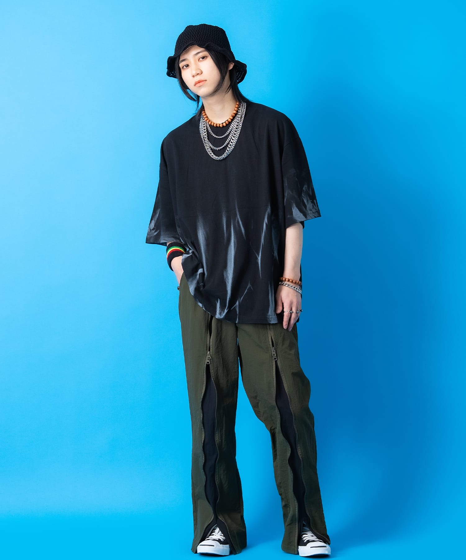 パリっとした渇いた触感とマットな色味がクラシカルムード漂うナイロン生地×ウエスト下から裾までフロントセンターをバッサリとカットするダブルジップファスナーでのモーディーなスタイルがエレガント。ダブルジップの開閉で内側に配置したボディーと別色の同生地がチラリと覗くツートーンギミックで、ジップを閉めてシンプルに、開け閉めを調節してツートーンカラーで、アシンメトリーで開け閉めして変化をつけて・・とアイデアやコーディネートによって色々と楽しめるのも重要ポイント。ややルーズなボリュームにフロント中央裾へのスリットで柔らかくフレアシルエットを構築したエレガントなフォルムも印象的。フォルムもジップの開け閉めで変化するモード感溢れる一本。