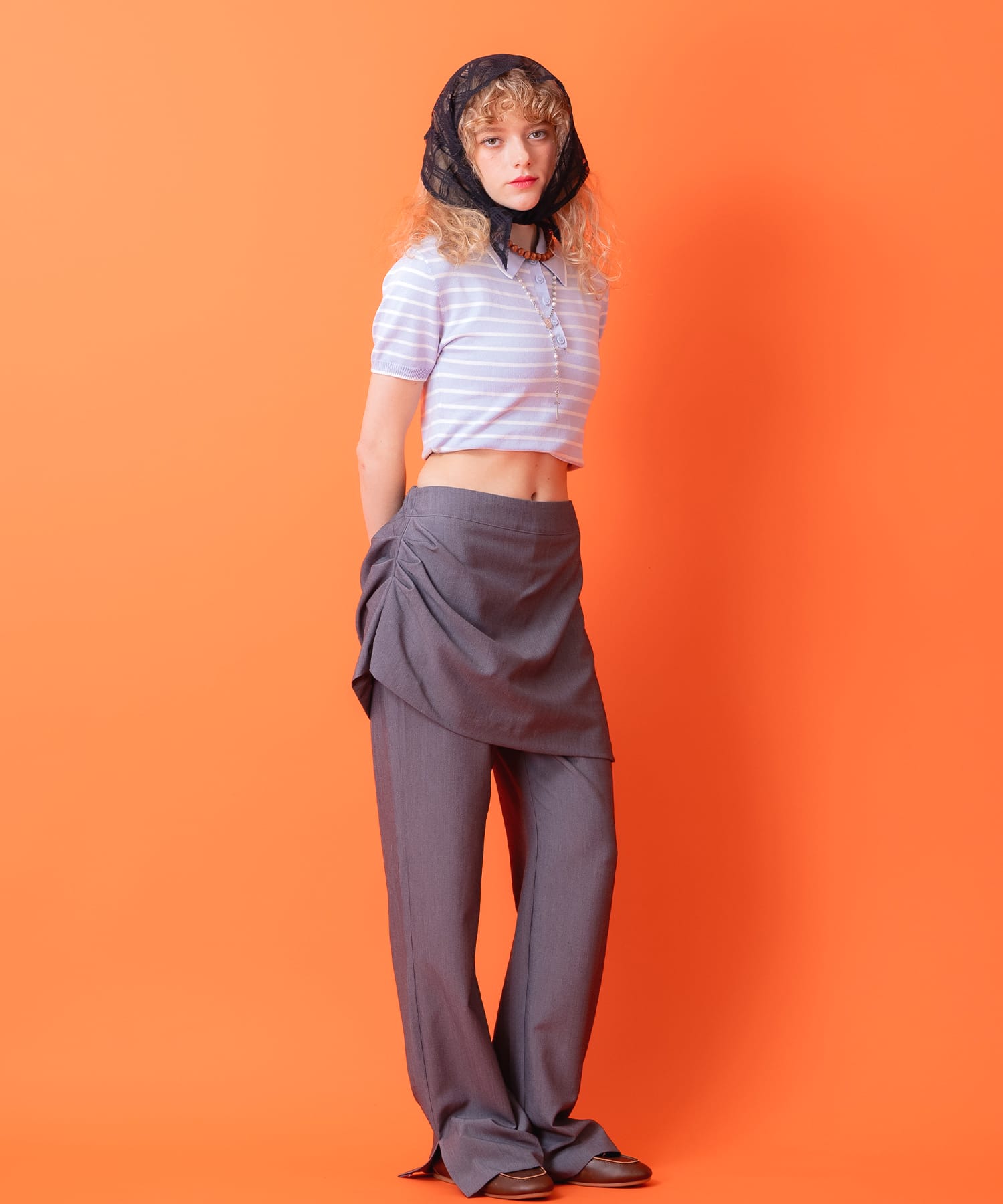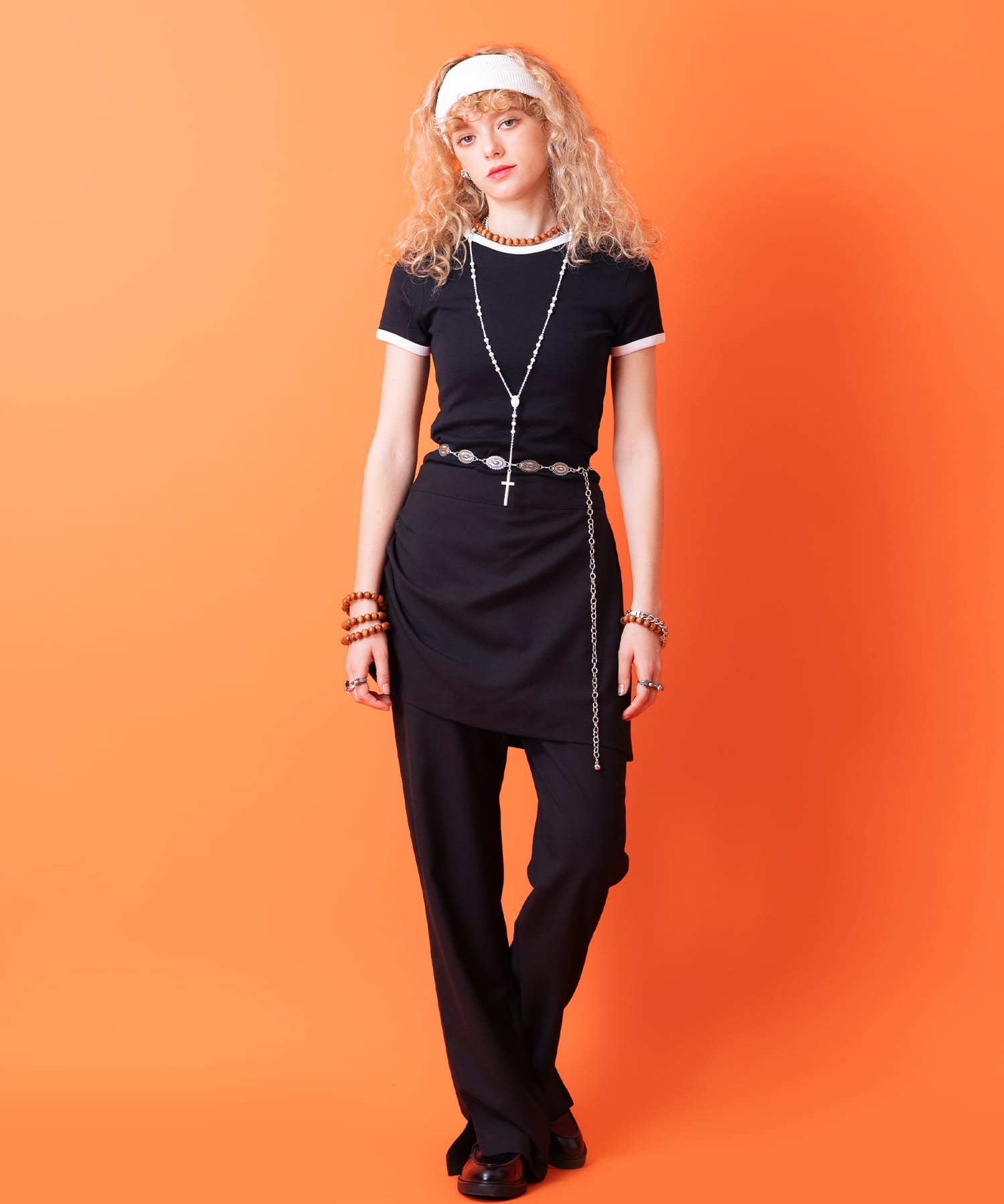 90s、Y2Kトレンドの流れからも注目のスカッツ/スカートレイヤードパンツ。90年代の空気感を感じさせるダブルボトムスタイルが逆に今新鮮。バックウエストゴムリブウエストでのレディースフリーサイジングがストレスフリーに穿ける一本。