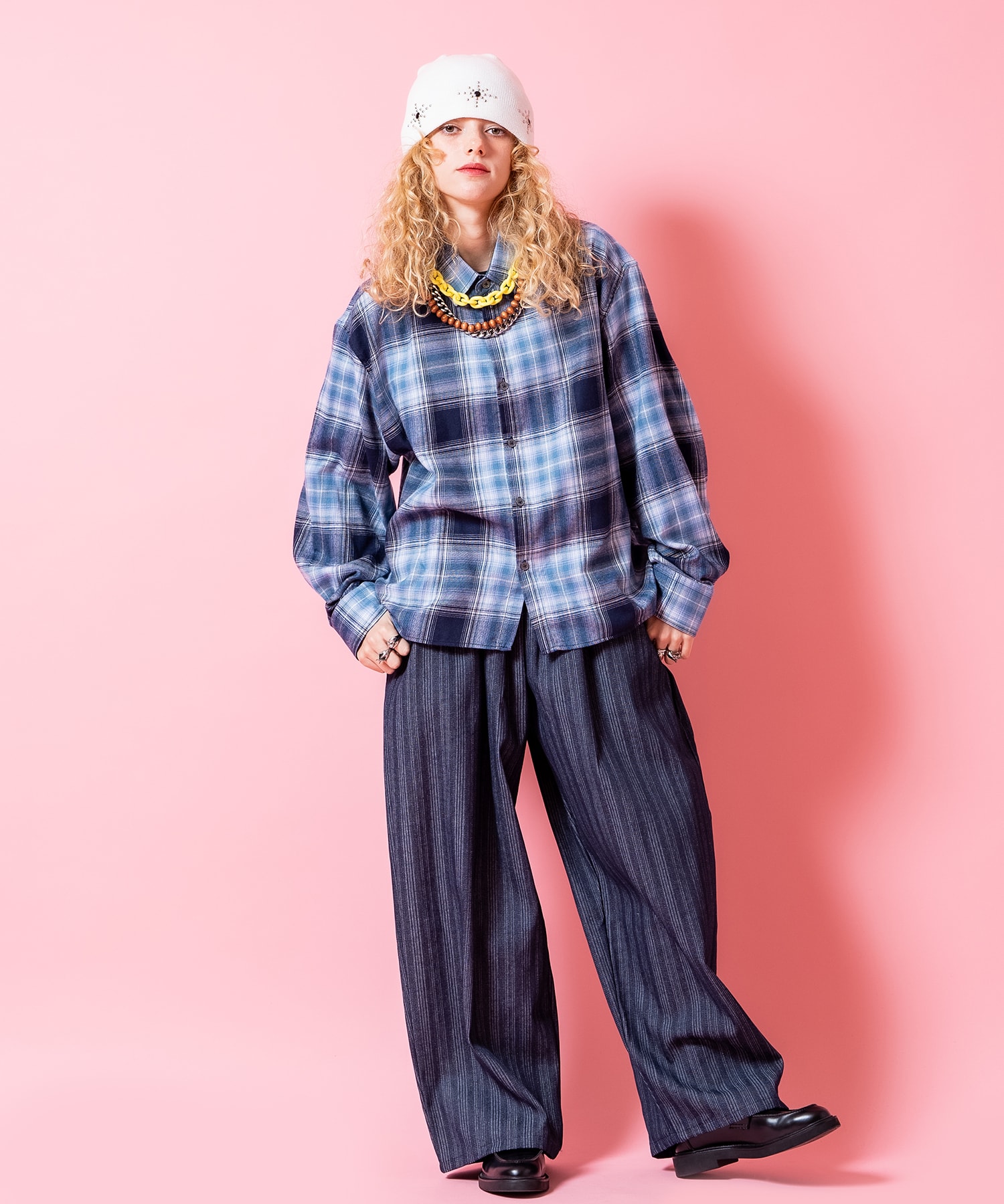 深々ととった股上や超絶極太なワタリ、ズドンと落としたようなスーパーワイドシルエットのストリートスタイルなルーズインパクトはそのままに、ヘリンボーン織りや差番手で立体感をもたせたクラシックムード漂うストライプ柄でレトロエレガントなグッドムードスタイルへとブラッシュアップ。韓国ストリートファッションの『今』を映し出すようなデザインスタイルは、90s/Y2Kスタイル、古着ミックス、アメカジやワークスタイルなどのクラシックムードなスタイルはもちろん、スケーター、ストリートスタイル、グランジといったカジュアル全般、さらにはモードスタイルやキレイメなどのハズシアイテムやアクセントとしても◎