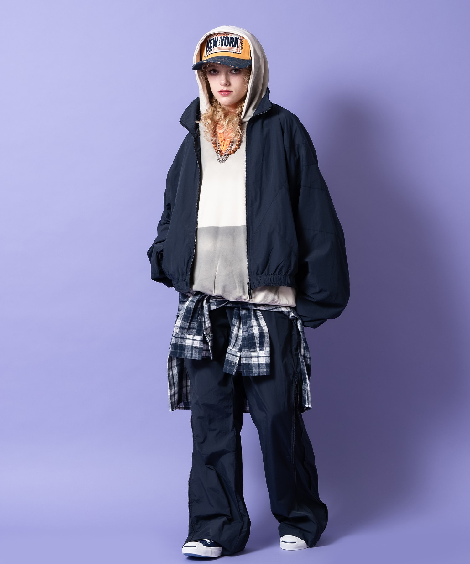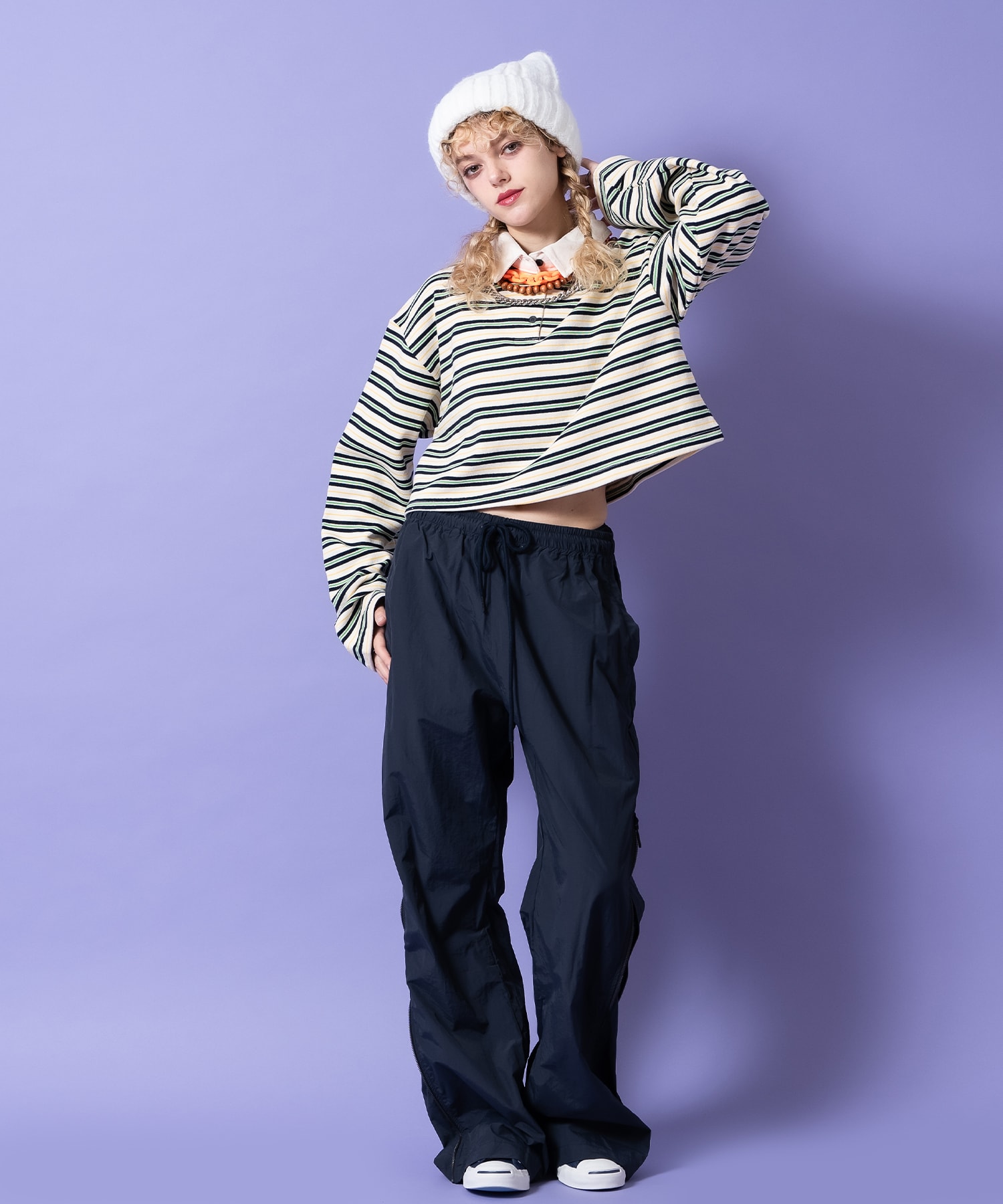 • a.p.o.v. サイドジップ変形ワイドフレアナイロントラックパンツ