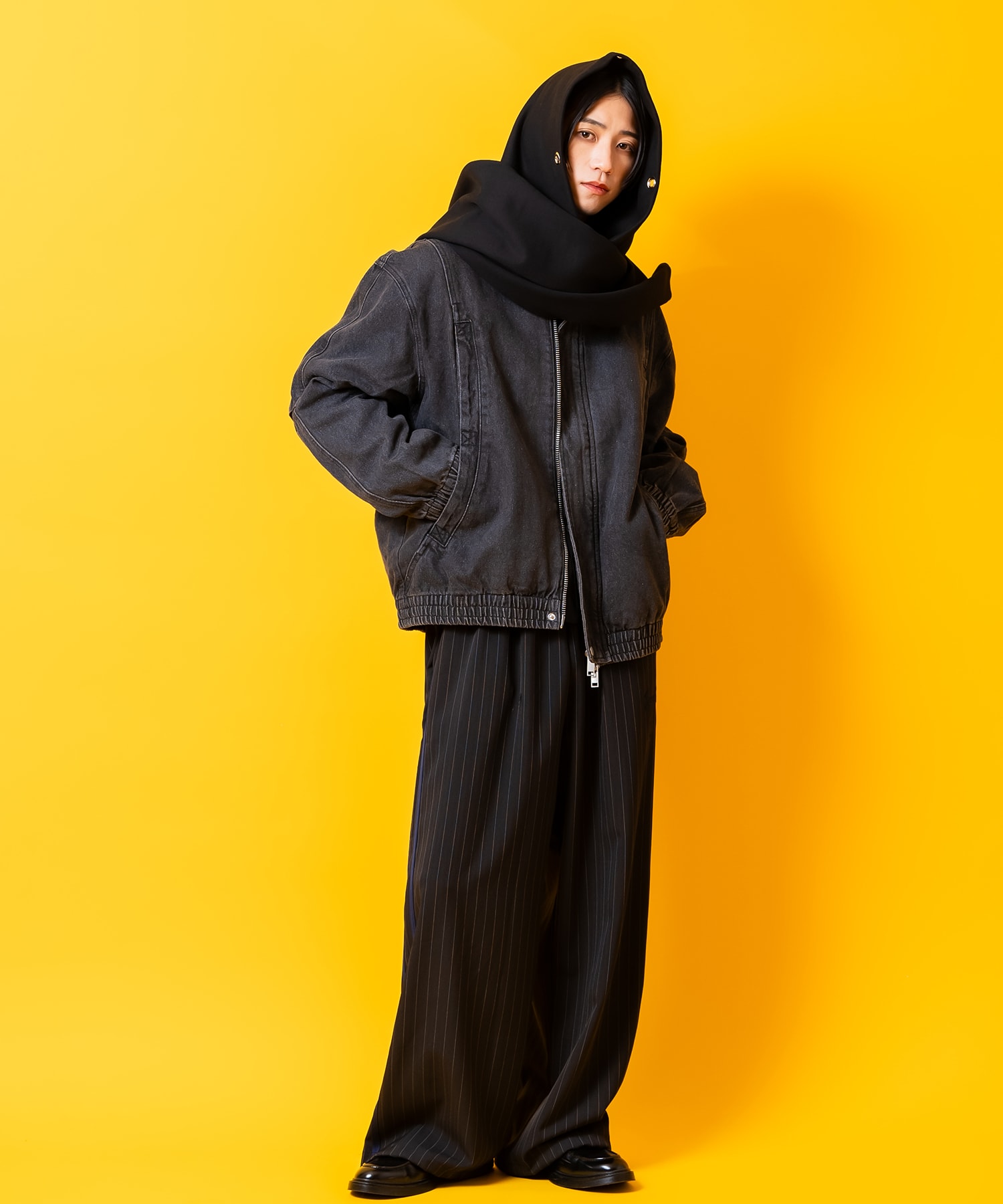 顏を覆う程の大きなフード×たっぷり首回りにボリュームをもたせてくれるワイド&ロングのマフラーパターンでストリートライクかつダーティーな雰囲気がグッドムード。フロント淵にあしらった大粒のアイレットをスタッズ打ちしたアッパーかつどこか無機質なモードニュアンスを漂わせるアクセントも好ギミック。コットンミニ裏毛のスウェット素材、ラギッドな生デニムと、キャラクターの異なるブラックカラーの2パターン展開。韓国ストリートファッション、スケーター、ストリートスタイル、モード等はもちろん、90s、Y2Kスタイル、古着ミックスやアメカジといったニュートロな空気感のアクセントとしても使いまわしのきく一品。