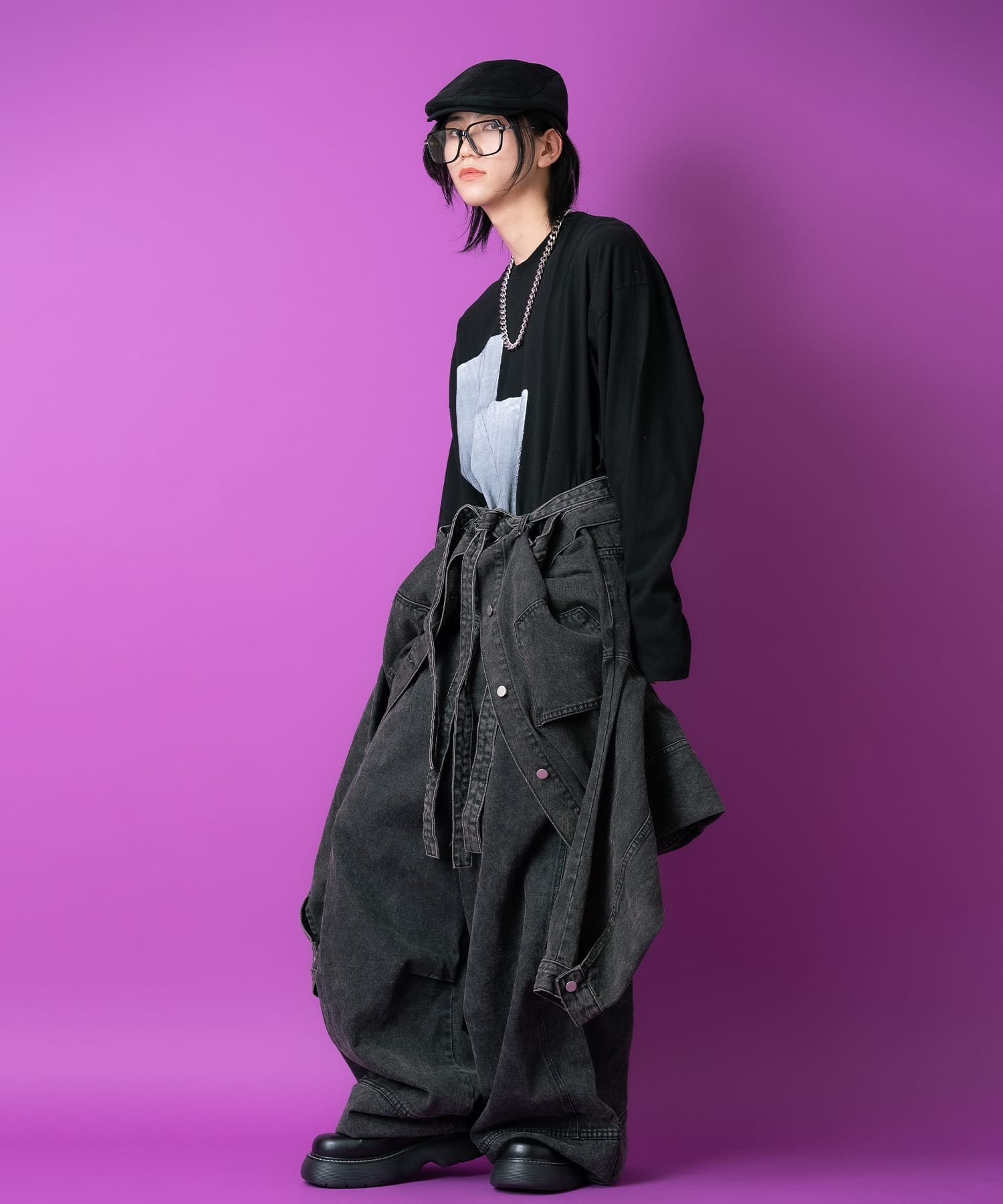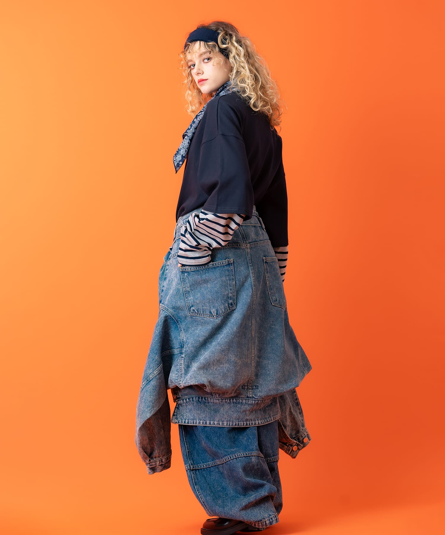 クラシックなGジャンスタイルをベースにしつつ、無機質なスクエア型の大きめ貼り付けポケット、ウエストロングコードベルトを配置しライダースジャケットの要素を大胆ミキシングしアッパーなスタイルへと昇華。さらにバックフェイスを逆さまにするとちょうどボトムスのパンツのようになるようデザイニングされたギミックを採用し、腰巻した時にジャストでハマるデザインが独創的。モードやストリートスタイルはもちろんのこと、90s、Y2K、アメカジ、古着ミックスなどトレンドのレトロな雰囲気にも相性抜群な一着。同ロングベルトデザインのデニムパンツとのセットアップでも着用可能。
