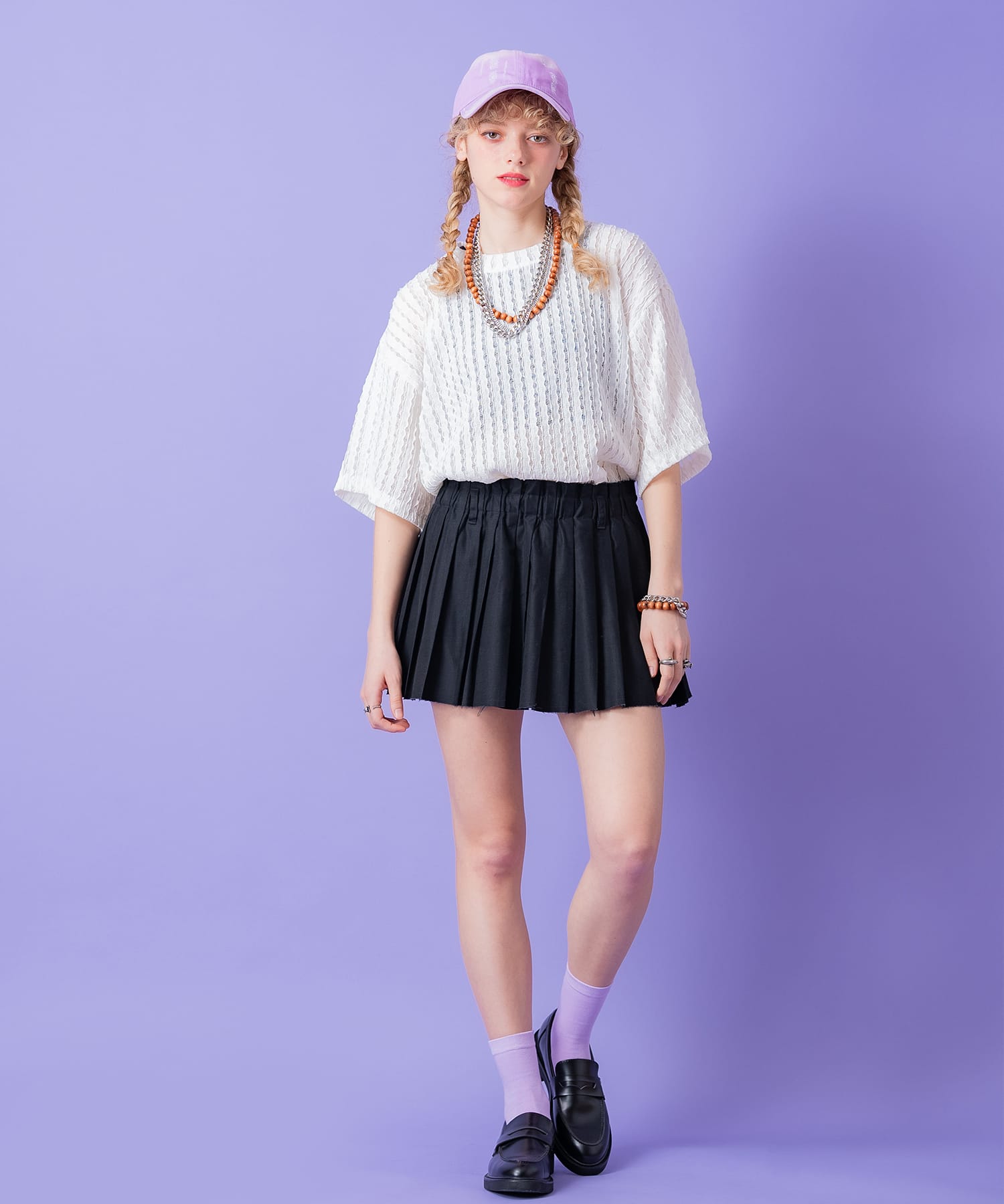 軽やかでストレッチ感が気持ちいいポリ素材×ボコボコっとした立体感を与えつつ波打つようなストライプと横糸を剥き出しにしてレース編みしたニット仕様がエレガント。同色のストライプ柄模様で派手になり過ぎない上品なベースにリズミカルに透け感を与えたシースルー、シアーアプローチはエッジィなモードニュアンスと行き過ぎないセクシーなニュアンスを兼ね揃えた好バランス。一枚でもサマになる主役顔かつどこかレトロな空気感も漂わせるデザインはグランジスタイルやストリートにモードスタイルはもちろんのこと、90s、Y2Kファッション、アメカジや古着ミックススタイルなどにも相性抜群な一枚。