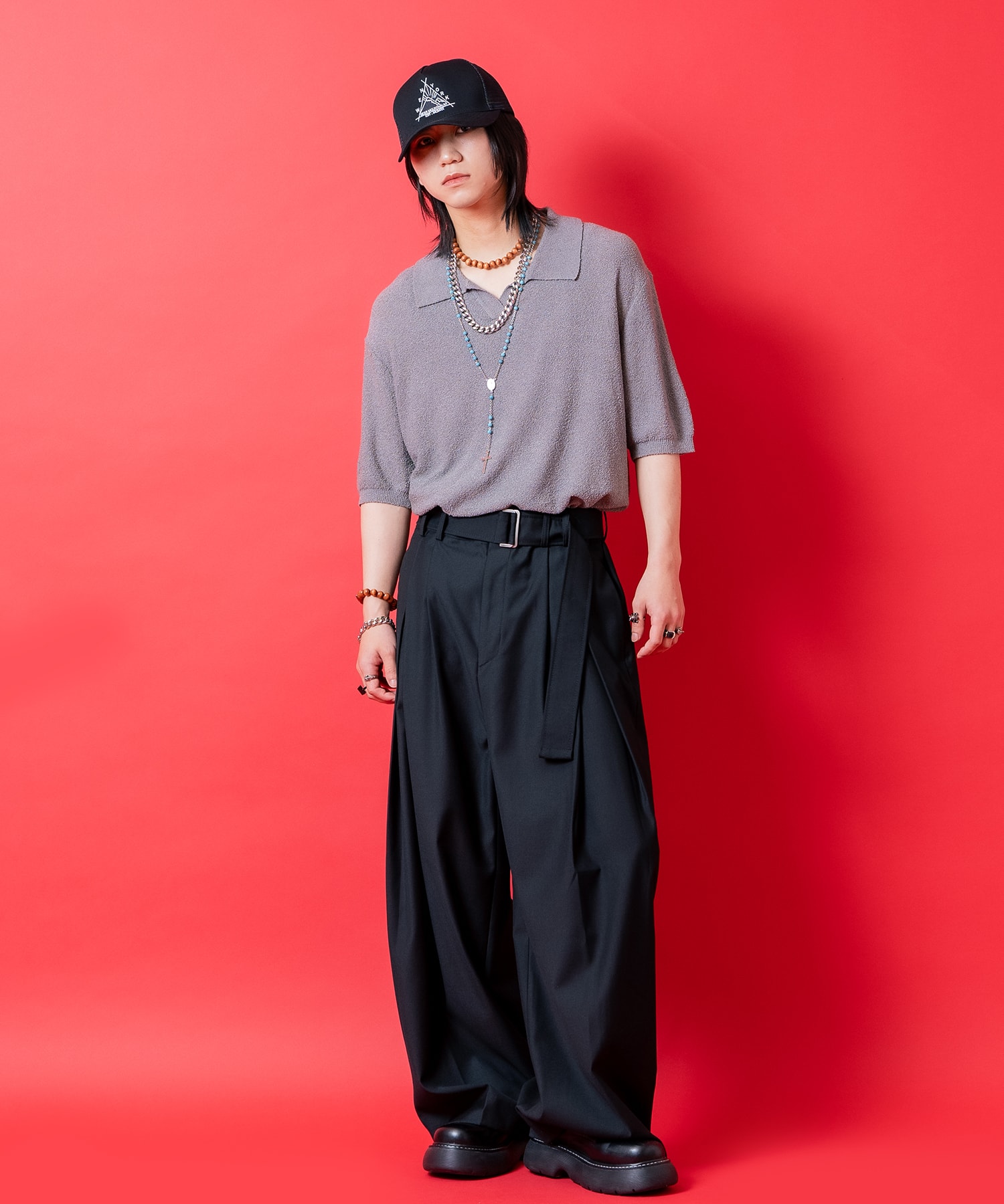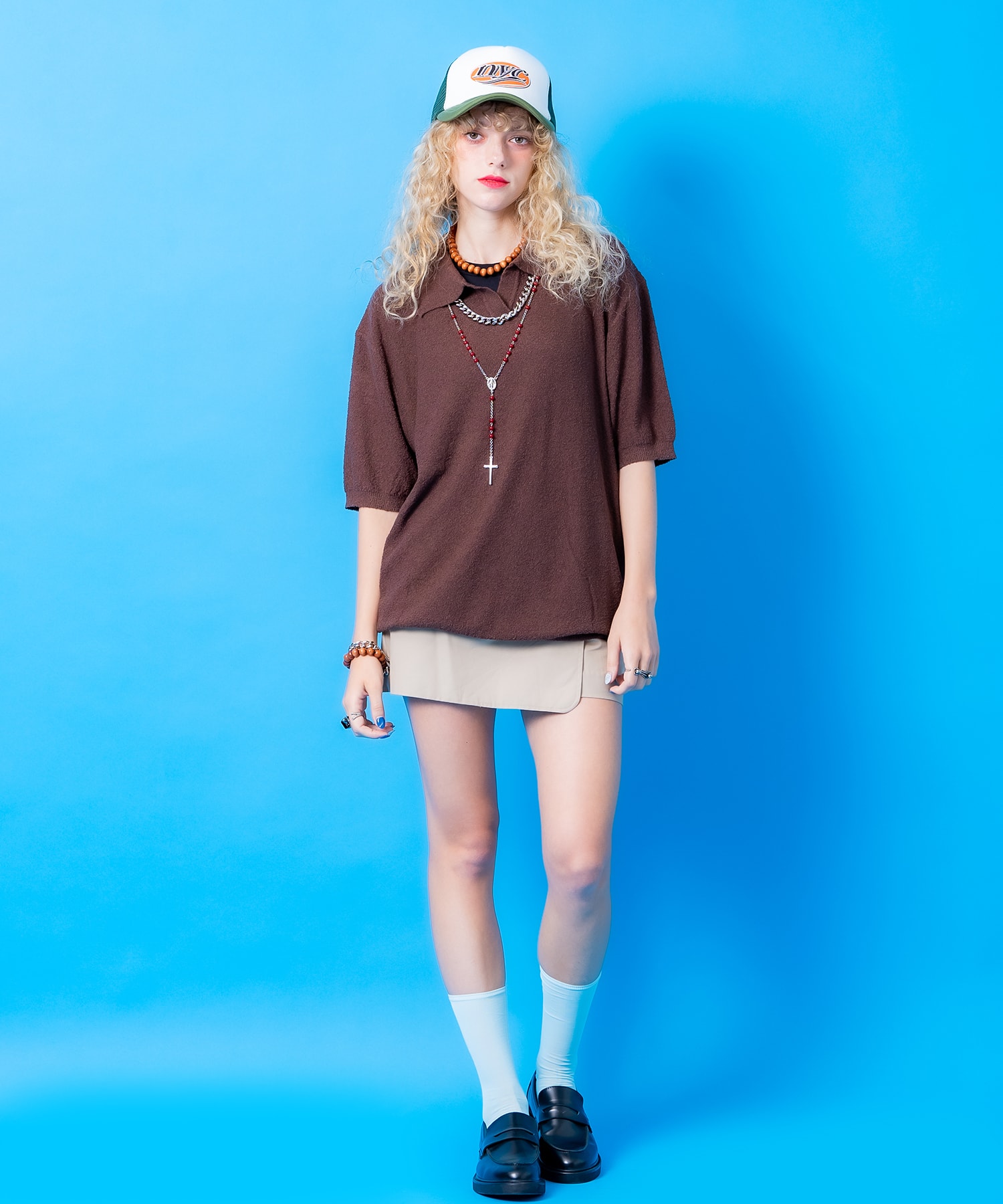 ムニムニっとした独特の触感とレトロなムードを感じさせる上品な表情が印象的なポリパイルニット生地×クラシックなスキッパーデザイン/オープンカラースタイルがエレガント。無駄を削いだミニマルでシンプルなデザインはストリートやモードスタイルはもちろんのこと、90s、Y2Kファッション、古着ミックススタイルなどにも相性抜群な一枚。