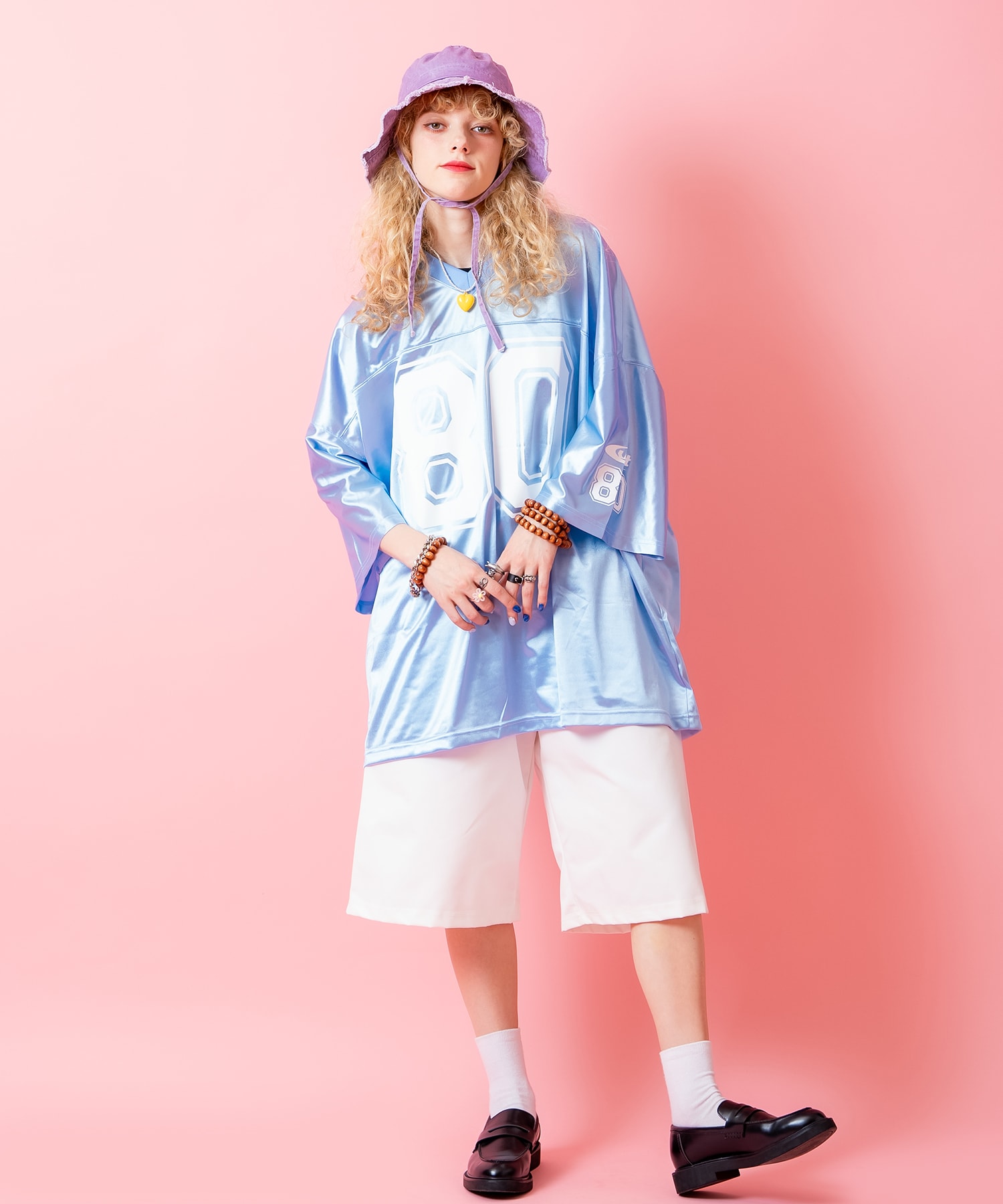 ギラギラっとしたラギッドな艶感がグラマラスなシャイニーポリ生地×フロントへのナンバリングプリント、バックへのショルダーへのロゴとビッグナンバリングでインパクトスタイルを構築。フロントはシンプルなナンバリングながらバックをロゴと組み合わせる事で対比を作り出したテクニカルなアプローチも◎。本格的なゲームシャツモチーフながらラフにTシャツやカットソーとしても着たい一枚。