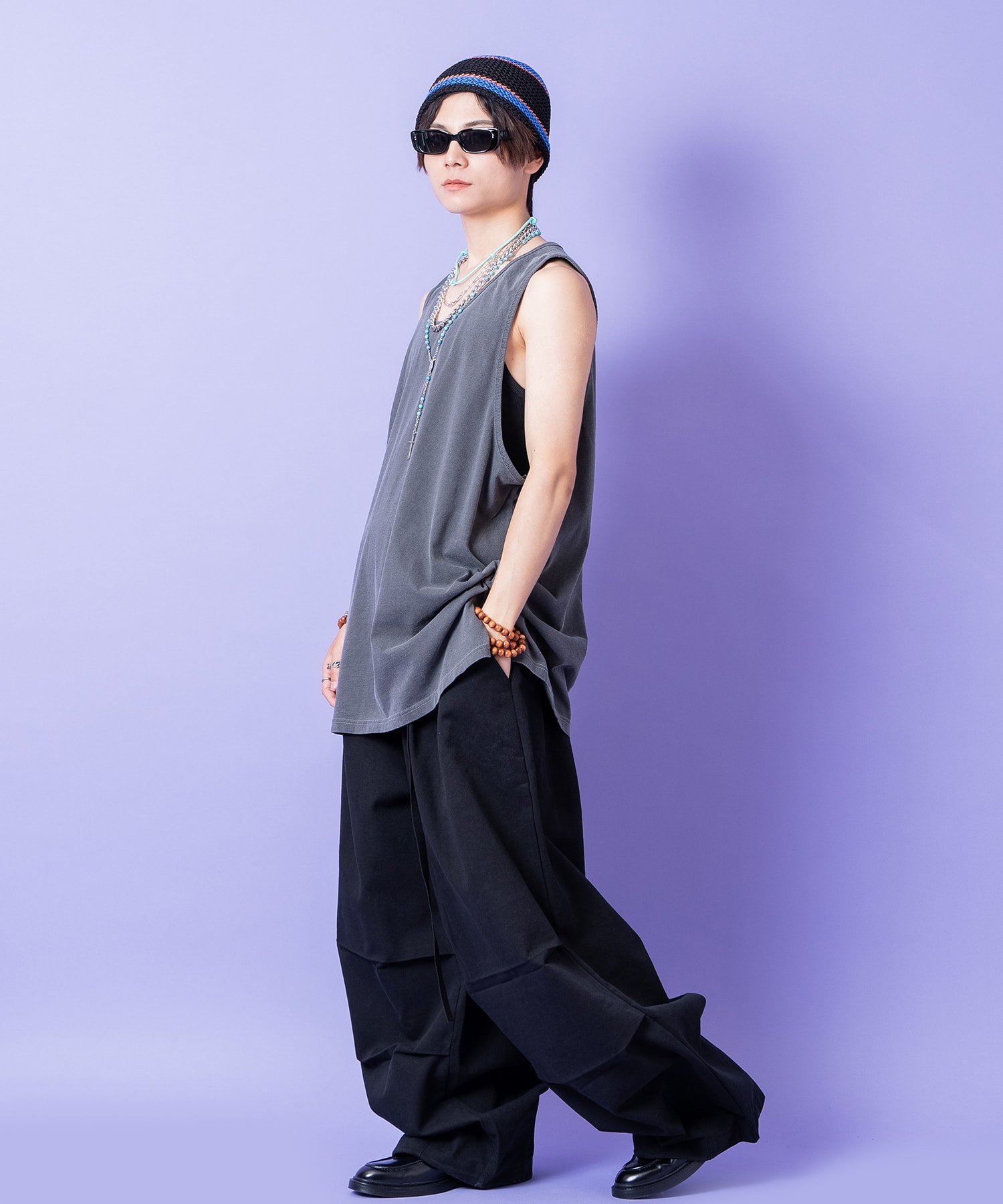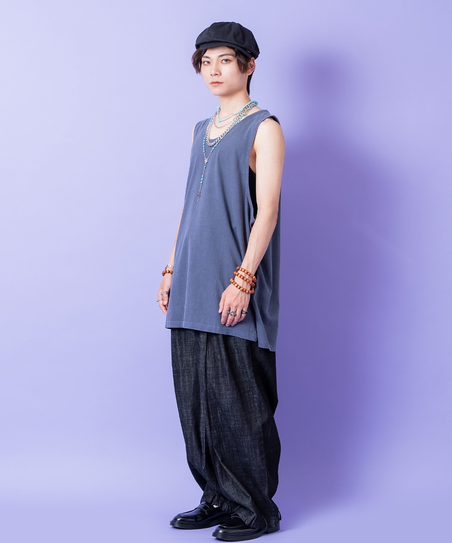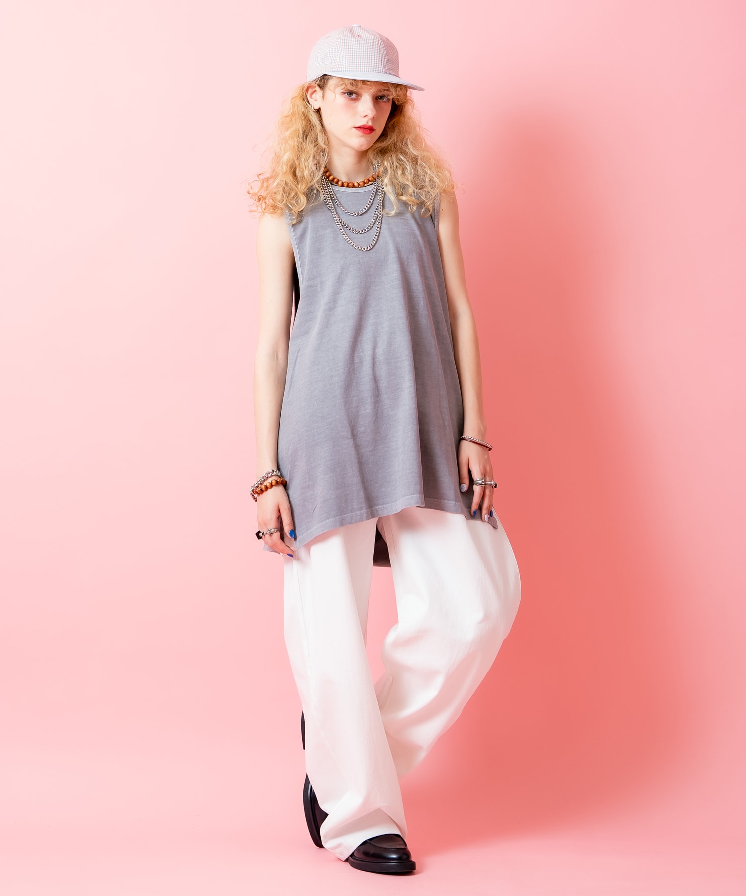ピグメントウォッシュ加工を施したヴィンテージライクな空気感漂わせるフェード感溢れるグッドムードな表情、Uネック、フラットカット裾・・極端に無駄を削いだミニマルなデザイン×ダボっとラフにストリートな感覚でとりいれられるオーバーサイズ/ビッグシルエットが印象的。シンプルなスタイルは一枚ではもちろん、インナーや重ね着にも汎用性抜群で、ストリートやモードはもちろんのこと、トレンドの90s、Y2Kファッション、古着ミックススタイルやアメカジと、スタイルを選ばない『使える』一枚。