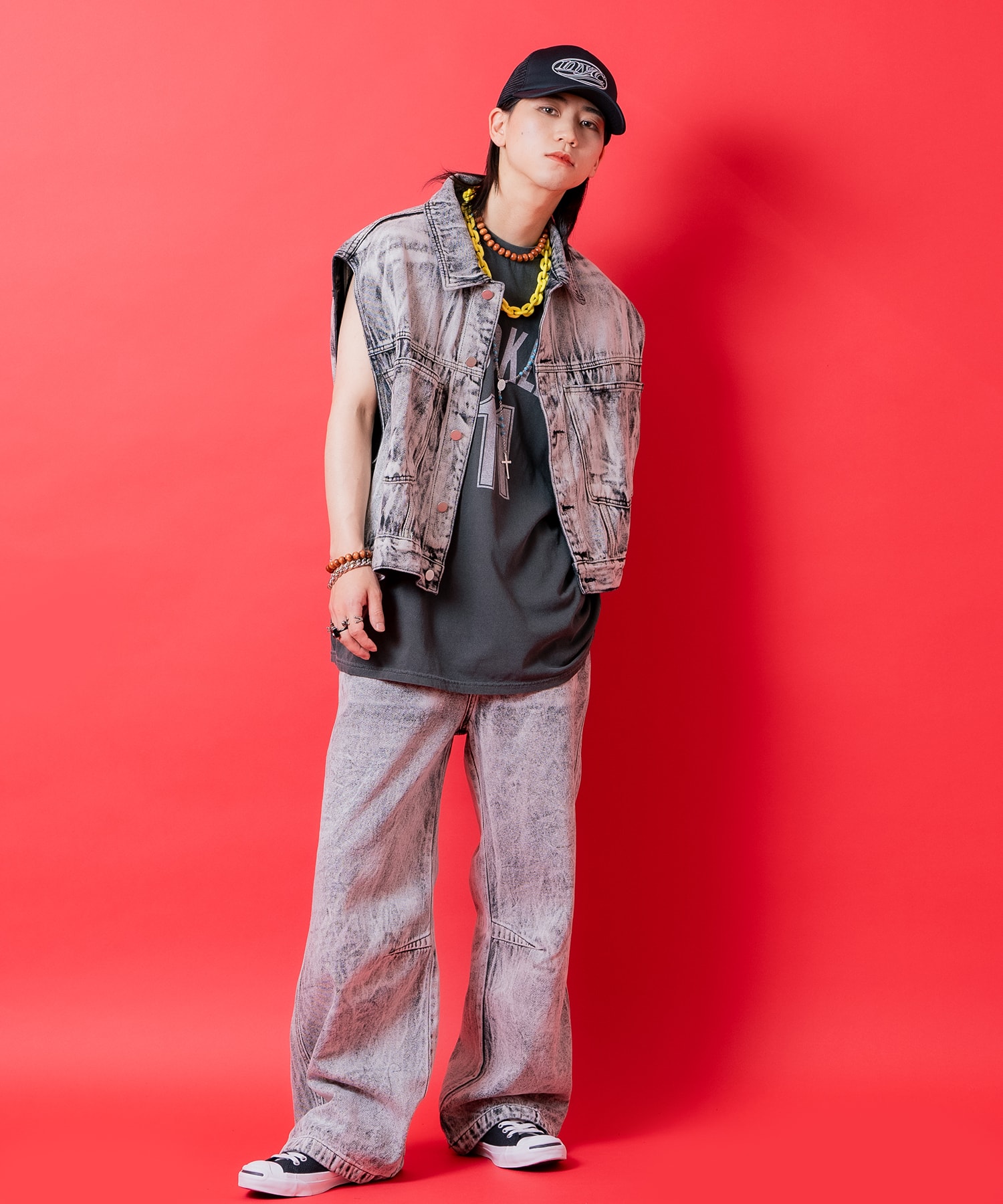 一見してヴィンテージライクかつどこか無機質なモード感漂うラギッドな雰囲気が圧倒的な存在感のメガブリーチコットンデニム生地が衝撃的。黒色のデニムを白色になるまでハードに色落ちさせたアッパーな表情×無骨でクラシカルなトラッカージャケットスタイルを現代モード的なアプローチのストリートニュアンスに変換させる幅広のオーバーサイズシルエットも世界観にマッチ。半袖やノースリーブアイテムとのレイヤードはもちろん、長袖Tシャツやシャツなどとのレイヤード、コートやジャケットのインナーにもってきても・・アイデアと感性で自由に『使い倒せる』汎用性抜群な一着。同デザインのパンツとのセットアップスタイルでも◎