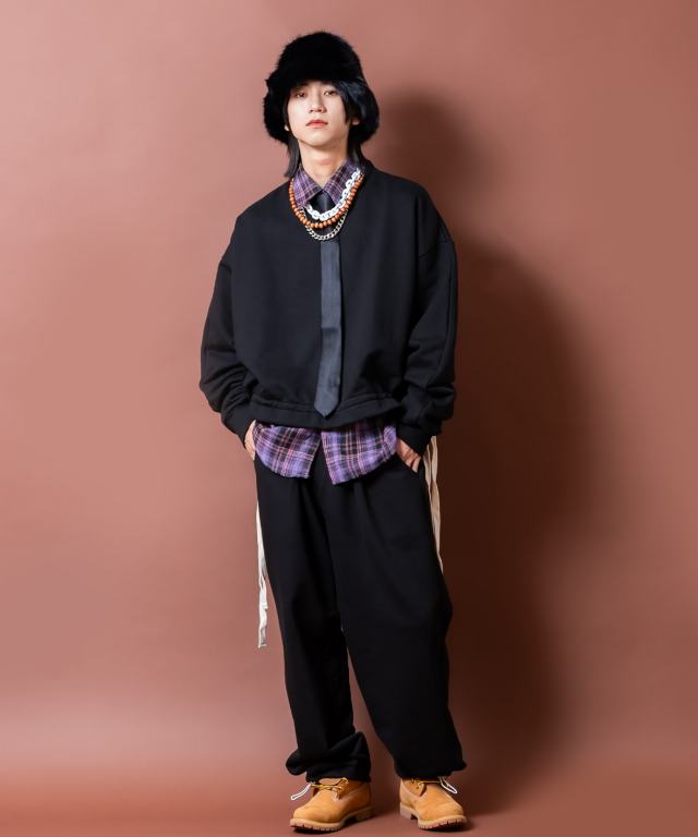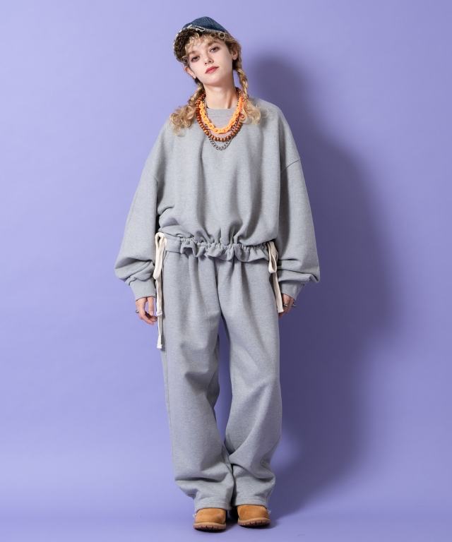 90sムード直系かつイットなトレンドスタイルの短丈(クロップド)スタイル×さらに絞る事でシャーリング調のドレープスタイルへ変形可能な裾へのワイドなドローコードデザインが一見してインパクト。ダボっとした極ワイドなアームや身幅のルーズなフォルムとミックスすることで古臭くなり過ぎない現代モードな空気感にしっかりと着地。どこか無機質なポップ感とモード感が交差する裾サイドに配置したワイドなドローコードスタイルは、そのまま流しても、結んでリボンのようなアクセントを作っても、絞って短丈にバルーンライクな絞りを与えてもバッチリなアイデアと感性で自由に遊べる好ギミック。ブラックとグレーカラーのみ、同生地を使用したルーズなワイドスウェットパンツ(seb0220)とセットアップライクにも着用可能かつアンニュイなスタイルを構築できる主役顔な一着。90s/Y2Kスタイル、古着ミックス、アメカジやワークスタイルなどのクラシックムードなスタイルはもちろん、韓国ストリートファッション、スケーター、ストリートスタイル、グランジといったカジュアル全般、さらにはモードスタイルやキレイメなどのハズシアイテムやアクセントとしても◎