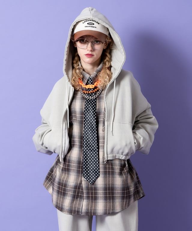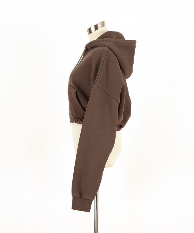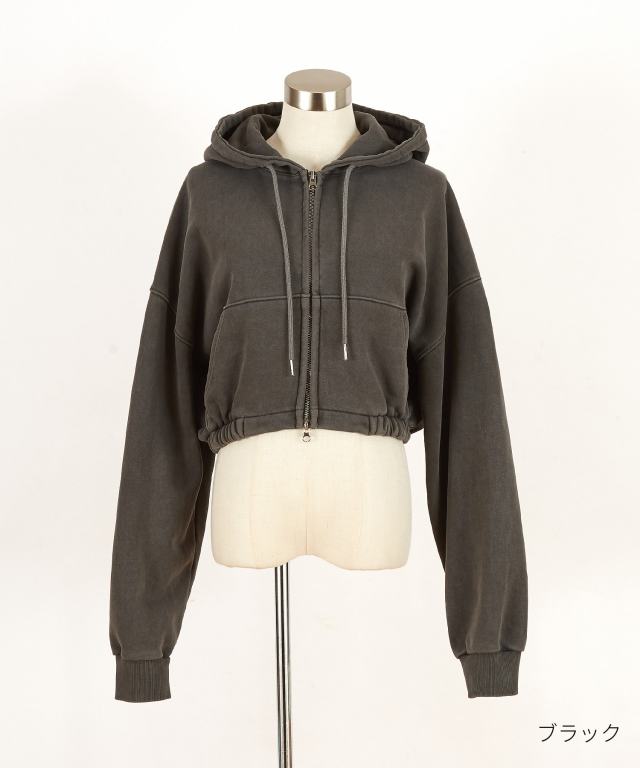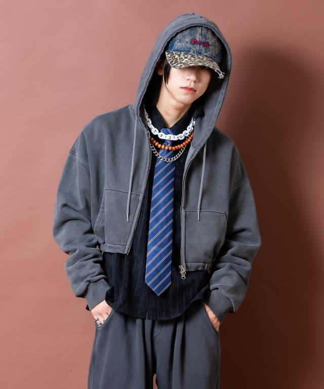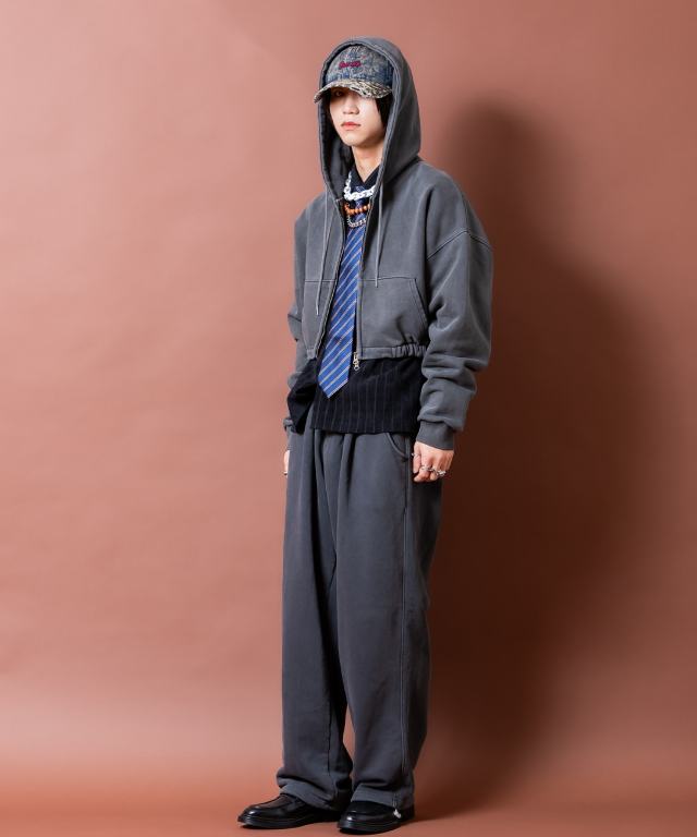90sムード直系かつイットなトレンドスタイルの短丈(クロップド)スタイル×肉厚なヘヴィーウェイトのコットンスウェット生地をベースにまるでヴィンテージ古着のような色落ち感やフェードした空気感を表現したピグメント加工でストリートなニュアンスにグランジな雰囲気をミキシング。ダボっとしたワイドなアームや身幅のルーズなフォルムとミックスすることで古臭くなり過ぎない現代モードな空気感にしっかりと着地。アッパーなシルエットワークを邪魔しないリブ無しかつしっかりと絞りをゴムで入れることで立体的なバルーンフォルムを構築したさりげないギミックに加え、クラシカルなカンガルーポケット使い、着こなしの幅を広げるダブルジップアップ仕様のファスナーなど無駄を削いだミニマルな作りがセンス◎。同生地のルーズなワイドスウェットパンツ(seb0222)とセットアップで着用可能かつアンニュイなスタイルを構築できる主役顔な一着。90s/Y2Kスタイル、古着ミックス、アメカジやワークスタイルなどのクラシックムードなスタイルはもちろん、韓国ストリートファッション、スケーター、ストリートスタイル、グランジといったカジュアル全般、さらにはモードスタイルやキレイメなどのハズシアイテムやアクセントとしても◎