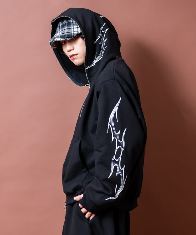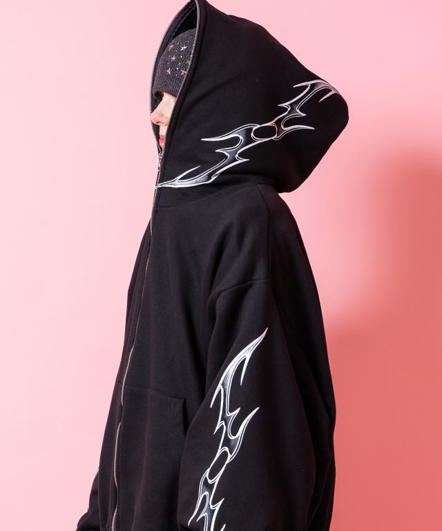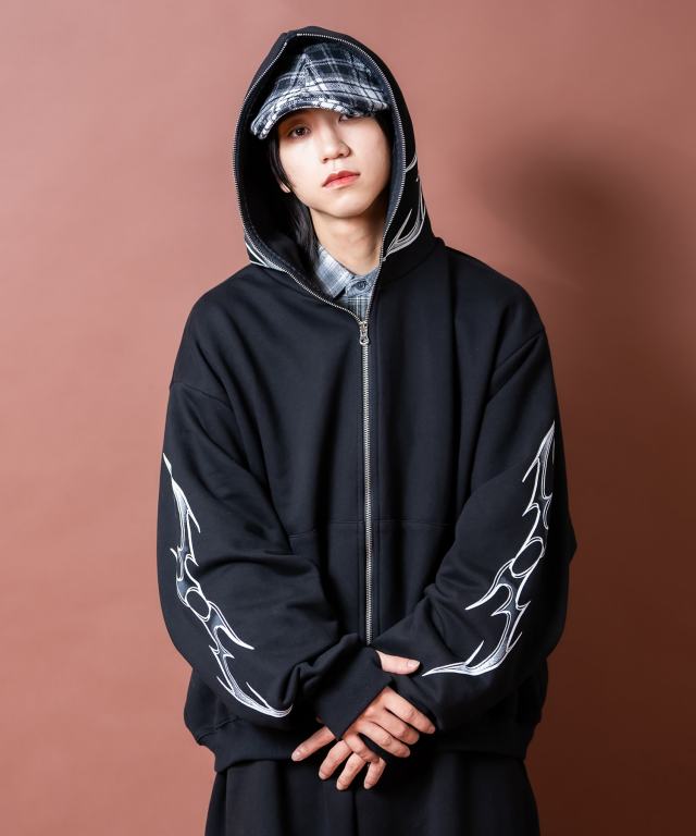 ワイドアームやドロップショルダー、ダボダボな身幅のオーバーサイズながら丈をショート丈バランスで短めにとった今顔シルエットをベースに、フードとアームへのクラシックな炎を現代ストリートライクなゴシック調のデザインでプリントした圧倒的な存在感が印象的。ダブルジップファスナー、ネックのボリュームを自由に変化させられるフルジップアップ仕様など細部のギミックも◎。同生地、同デザインのスウェットパンツ(seb0236)とセットアップで着用可能かつアンニュイなスタイルを構築できる主役顔な一本。韓国ストリートファッションをはじめとし、90s/Y2Kスタイル、古着ミックス、アメカジやワークスタイルなどのクラシックムードなスタイルはもちろん、スケーター、ストリートスタイル、グランジといったカジュアル全般、さらにはモードスタイルやキレイメなどのハズシアイテムやアクセントとしても◎