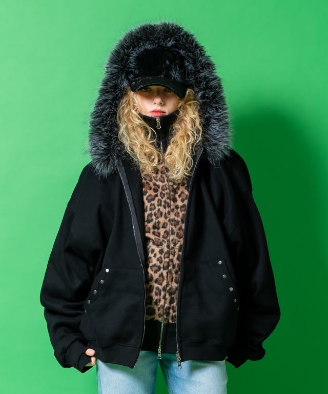 裏起毛ヘヴィーウェイトコットンスウェットの王道マテリアルをベースに、フード淵へあしらったボリューミーなファーでストリートゴシックかつグラマラスなニュアンスを表現。さらに2重構造でさりげなく指穴を配置したモードスタイルな袖口リブ、カンガルーポケット淵へのブラックシルバーリベットスタッズで世界観をより強固なものへと昇華。ダボダボのスーパーオーバーサイジングながら丈感を短めにとった短丈のイットなフォルムワーク、着こなしに幅をもたせるダブルジップアップファスナー、スナップボタンで簡単に着脱可能なファーなど、シルエットや細部のギミックも文句なく冬の主役パーカー間違いなしのマストな一着。韓国ストリートファッションをはじめとし、90s/Y2Kスタイル、古着ミックス、アメカジやワークスタイルなどのクラシックムードなスタイルはもちろん、スケーター、ストリートスタイル、グランジといったカジュアル全般、さらにはモードスタイルやキレイメなどのハズシアイテムやアクセントとしても◎